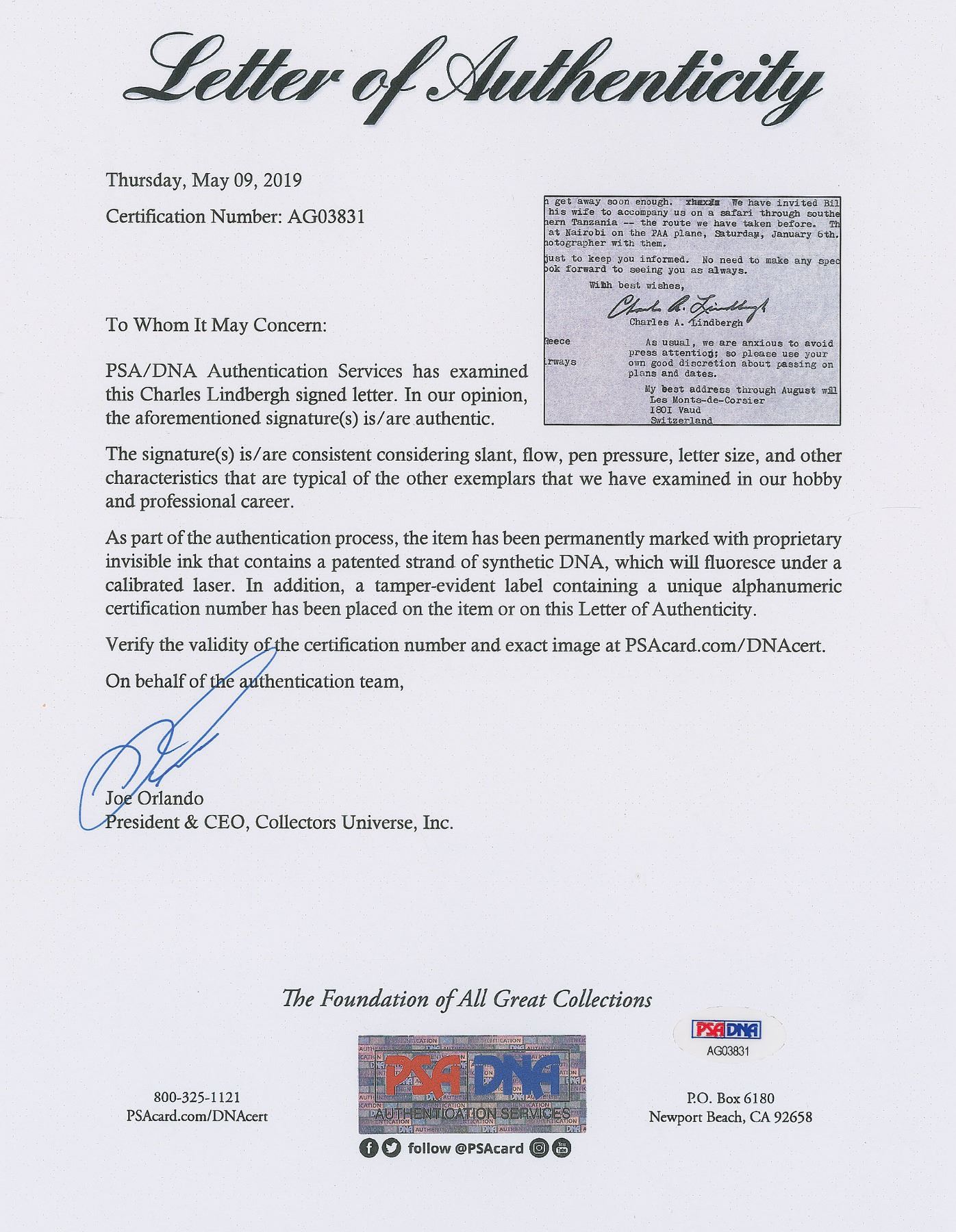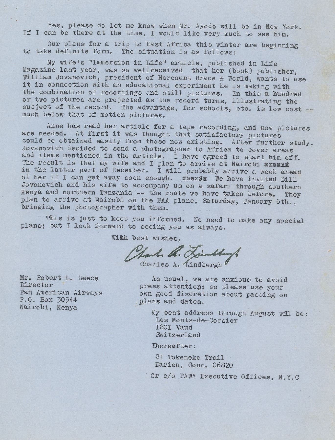TLS signed “Charles A Lindbergh,” two pages, 8.5 x 11, August 14, 1967. Letter to Robert L. Reece, director of Pan American Airways. In part: "I am greatly interested in our IHC hotels, much as I dislike all first-class hotels personally. They are, of course, essential to Pan American business and to the welfare (in this case) of East Africa. (I am dubious about the effect they will have on our civilization in the long run; but I don't think Pan American is in a position to set policy on that basis—or East Africa!) Along with the Nairobi IHC, I believe an inn system is of tremendous importance. In fact I believe the hotel-inn system should be organized in many places where we land…I fully agree with you about the importance of our moving faster in the African area, and will talk again about this when I get back to New York next month. I think there is tremendous potential in Africa, and that we are not yet making plans in accord with it." He goes on to quote a letter from John Owen concerning transportation to East African national parks, and comments on his wife's 'Immersion in Life' article as well as a book project for Harcourt Brace. He concludes: "We have invited Bill Jovanovich and his wife to accompany us on a safari through southern Kenya and northern Tanzania—the route we have taken before." In very good to fine condition, with a long tear along the top edge of the second page. Accompanied by a full letter of authenticity from PSA/DNA.