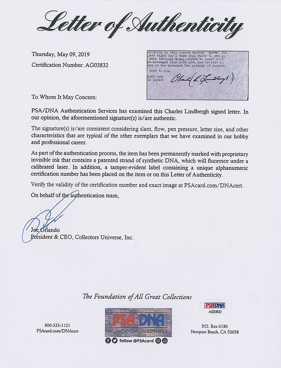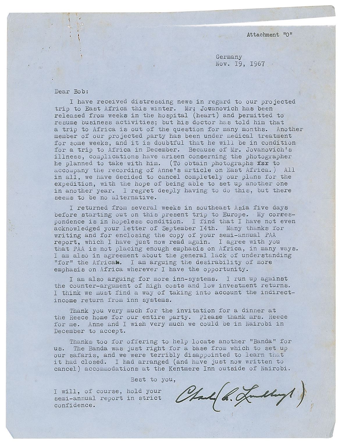TLS signed “Charles (A. Lindbergh),” one page, 8.5 x 11, November 19, 1967. Letter to Robert L. Reece, director of Pan American Airways. In part: "I have received distressing news in regard to our projected trip to East Africa this winter. Mr. Jovanovich has been released from weeks in the hospital (heart) and permitted to resume business activities; but his doctor told him that a trip to Africa is out of the question for many months. Another member of our projected party has been under medical treatment for some weeks, and it is doubtful that he will be in condition for a trip to Africa in December. Because of Mr. Jovanovich's illness, complications have arisen concerning the photographer he planned to take with him. (To obtain photographs to accompany the recording of Anne's article on East Africa.) All in all, we have decided to cancel completely our plans for the expedition, with the hope of being able to set up another one in another year…I agree with you that PAA is not placing enough emphasis on Africa, in many ways…I am arguing the desirability of more emphasis on Africa wherever I have the opportunity. I am also arguing for more inn-systems. I run up against the counter-argument of high costs and low investment returns. I think we must find a way of taking into account the indirect-income return from inn systems." In very good to fine condition, with a long tear along the top edge. Accompanied by a full letter of authenticity from PSA/DNA.