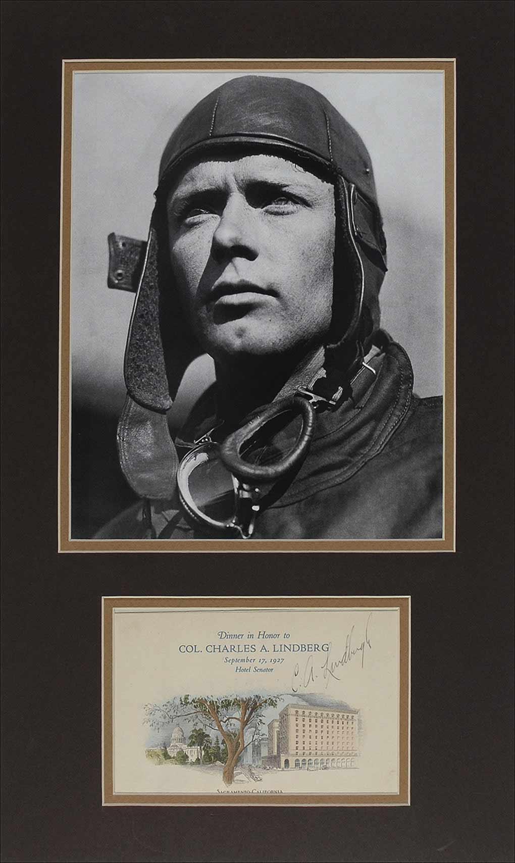 Dinner menu, 7 x 4.5, for a dinner held in honor of Lindbergh on September 17, 1927, at the Hotel Senator in Sacramento, California, signed on the cover in black ink, “C. A. Lindbergh.” Double matted with a magazine portrait of Lindbergh, to an overall size of 12 x 20.25. In fine condition. After Lindbergh returned from his historic overseas flight, he began a flying tour of the U.S. He landed in every state and visited nearly eighty different cities. The cities which were privileged to have his company overnight held dinners in his honor, which were commemorated with these elegant menus.