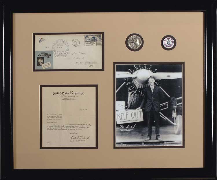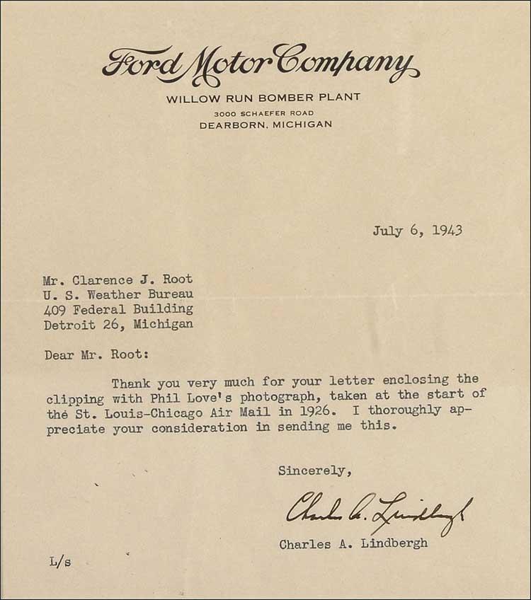 TLS signed “Charles A. Lindbergh,” one page, 6 x 6.5, Ford Motor Company letterhead, July 6, 1943. Letter to Clarence Root of the U. S. Weather Bureau. In full: “Thank you very much for your letter enclosing the clipping with Phil Love’s photograph, taken at the start of the St. Louis-Chicago Air Mail in 1926. I thoroughly appreciate your consideration in sending me this.” Double matted and framed with an original Ryan Aviation photo of Lindbergh standing in front of the Spirit of St. Louis, a 1928 Lindbergh-flown air mail envelope, and a commemorative medallion and pin, to an overall size of 24.75 x 21. In fine condition, with a few light creases and spots, and a light overall shade of toning. Oversized. Pre-certified PSA/DNA and RRAuction COA.