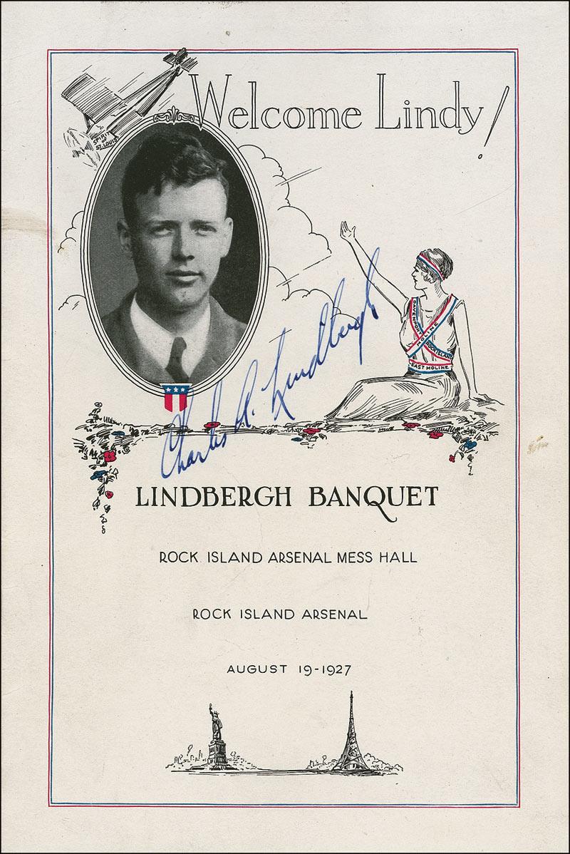 Dinner menu, 6 x 9, for a dinner held in honor of Lindbergh on August 19, 1927, at the Rock Island Arsenal Mess Hall on August 19, 1927, signed on the cover in blue ink, “Charles A. Lindbergh.” In fine condition, with a touch of light soiling, and some mild handling wear. After Lindbergh returned from his historic overseas flight, he began a Good Will tour funded by the Guggenheim family. He landed in every state and visited nearly eighty different cities. The cities which were privileged to have his company overnight held dinners in his honor, which were commemorated with these elegant menus. Pre-certified PSA/DNA and RRAuction COA.