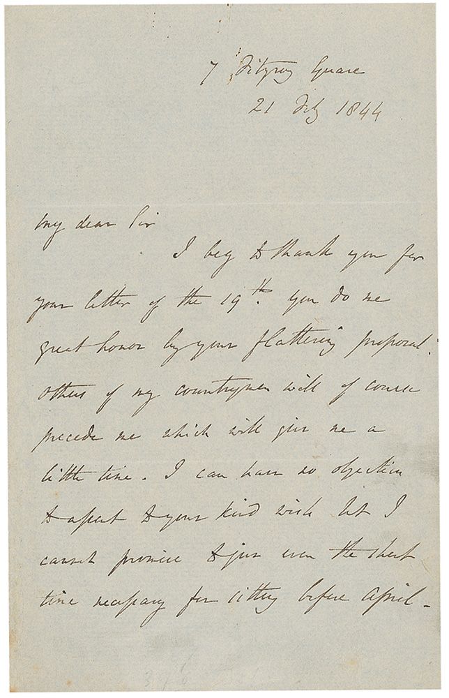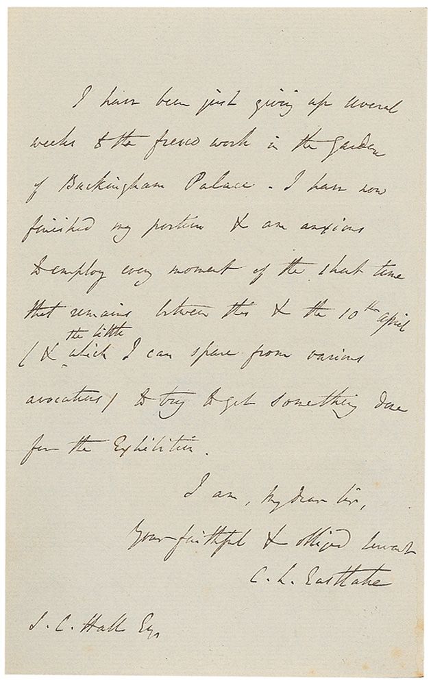 English painter and gallery director (1793–1865) famous for his portrait of Napoleon among other historical and biblical paintings. ALS signed “C. L. Eastlake,” one page both sides, 4.5 x 7, July 21, 1844. Letter to art journalist Samuel Carter Hall. In part: “You do me great honor by your flattering proposal…I cannot promise to you even the short time necessary for sitting before April. I have been just giving up several weeks to the fresco work in the Garden of Buckingham Palace. I have now finished my portion & am anxious…to try to get something done for the Exhibition.” Hall wrote a note on the second integral page, initialed “S.C.H.,” in full: “An answer to my request that Mr. Eastlake would sit for his portrait to be engraved in the A.N.” In fine condition, with some trivial foxing.