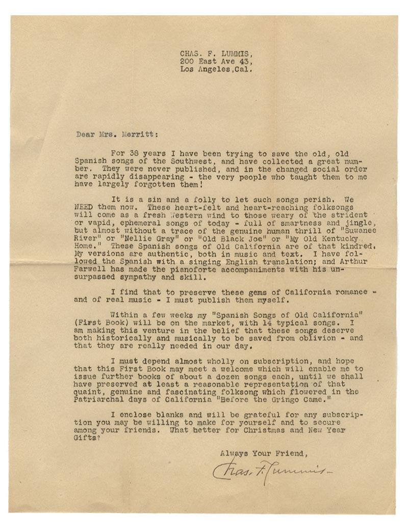 Charles Fletcher Lummis (1859 – 1928). United States journalist and Indian activist, historian, photographer, poet and librarian. TLS. 1 page. Concerning "Spanish Songs of Old Califronia". A pre-printed form letter concerning his book on Spanish Songs. Lummis signs at the conclusion. Folds. Fine.