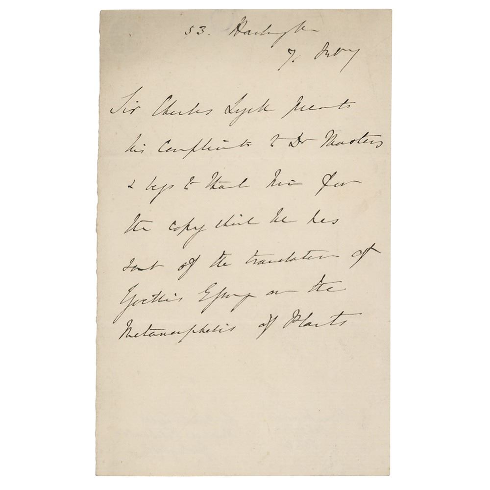 Geologist (1797–1875) referred to as the 'father of modern geology,' who was a close and influential friend of Charles Darwin. Third-person ALS, one page, 4.5 x 7, May 7, [no year]. Handwritten letter by the great geologist, in full: "Sir Charles Lyell presents his compliments to Dr. Masters & begs to thank him for the copy which he has sent of the translation of Goethe's Essay on the Metamorphosis of Plants." In fine condition. The Metamorphosis of Plants, published in 1790, was Goethe's first major attempt to describe what he called in a letter to a friend 'the truth about the how of the organism.'