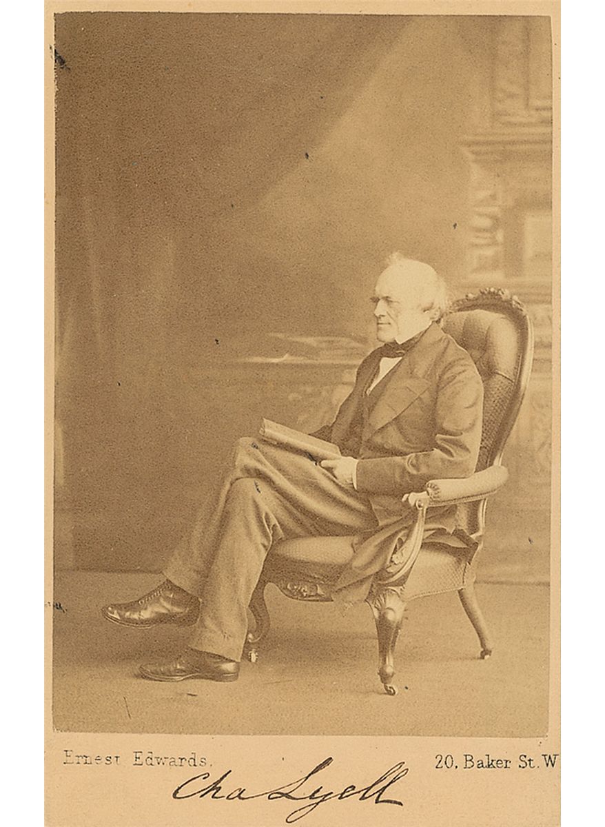 Geologist (1797–1875) referred to as the ‘father of modern geology’; close and influential friend of Charles Darwin. Original 2.5 x 3.75 carte-de-visite portrait of Lyell seated by Ernest Edwards of London, signed in the lower border in black ink, “Cha. Lyell.” In fine condition.