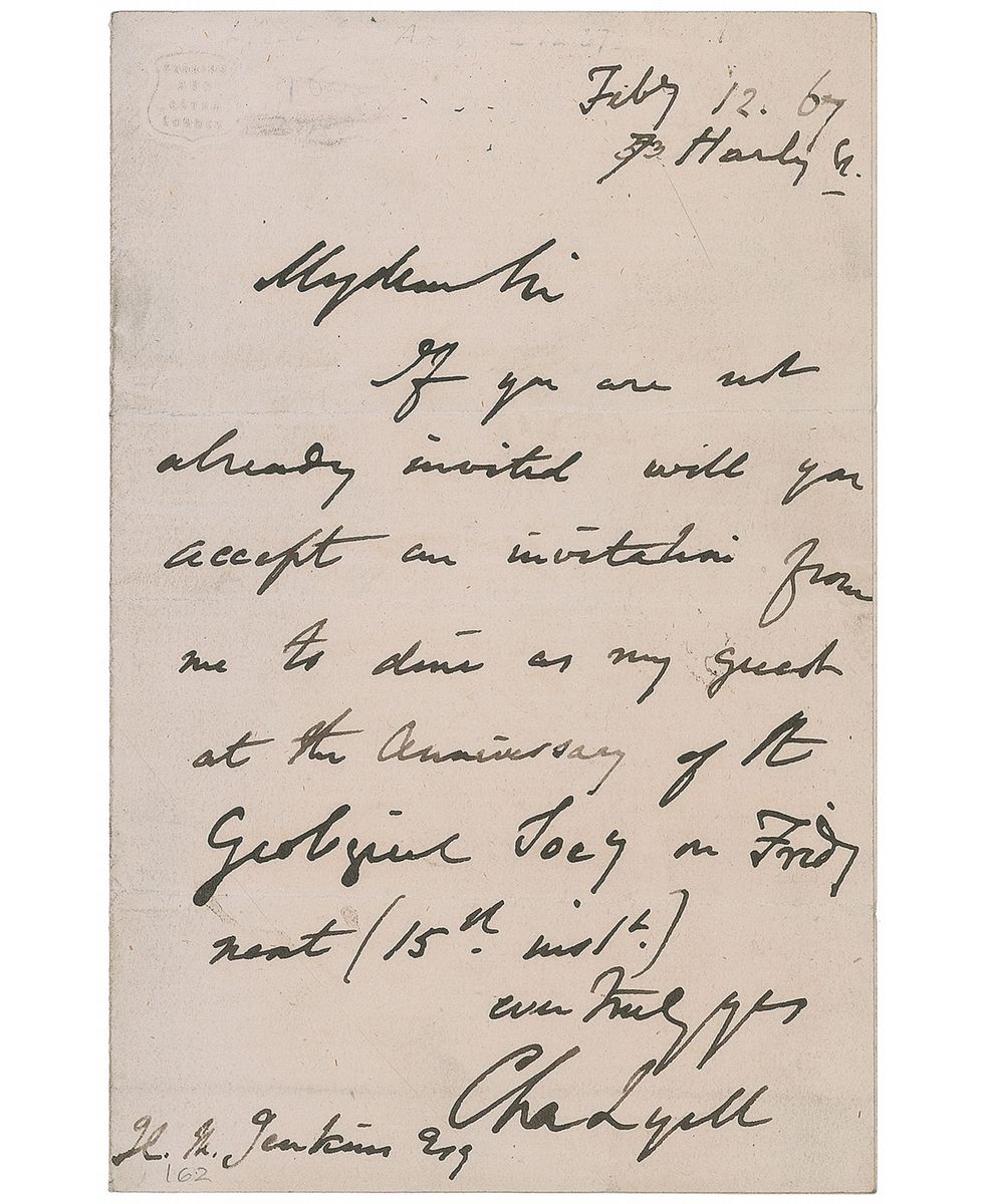 Geologist (1797–1875) referred to as the ‘father of modern geology,’ and close and influential friend of Charles Darwin. ALS signed “Cha Lyell,” one page, 3.75 x 6, February 12, 1867. Short letter to H. Jenkins. In full: “If you are not already invited will you accept an invitation from me to dine as my guest at the anniversary of the Geological Soc’y on Friday next (15th inst.).” In fine condition, with some scattered light soiling and a couple of pencil notations. Founded in 1807, the London Geological Society is the oldest known geological society in the world. After serving a term as president of the society, Lyell befriended Darwin upon his return on the Beagle—between January 1837 and March 1838, Darwin became a central figure in the Geological Society, presenting four papers on his Beagle findings and serving as the group’s secretary.