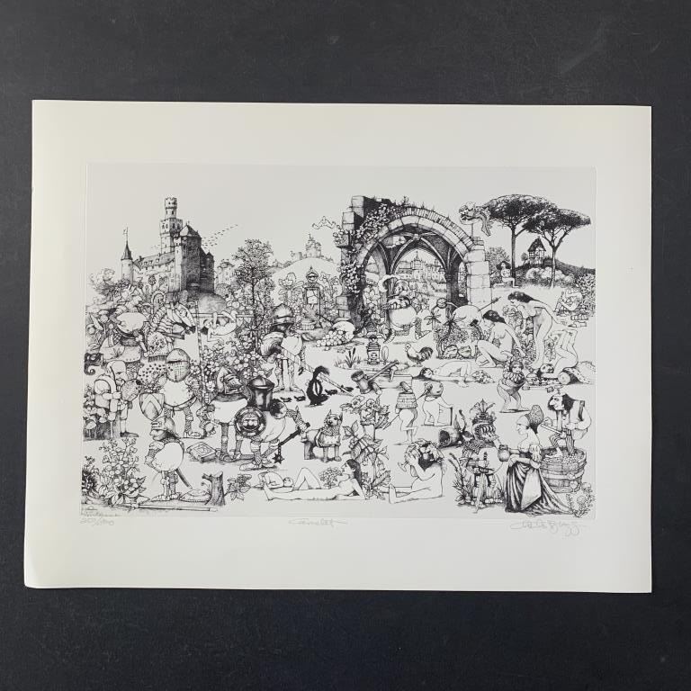 Charles Lynn Bragg's "Camelot" limited edition print, signed lower right and numbered 250/300 lower left. This piece is of a all the people who would have been in Camelot, with a bit of an 'X' rated twist. This piece is in excellent condition.