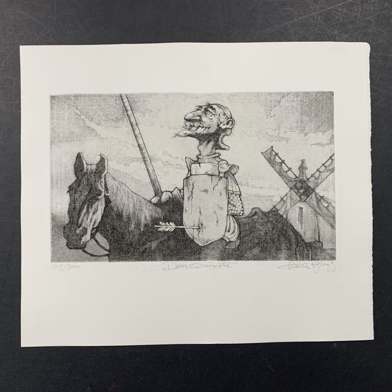 Charles Lynn Bragg's "Don Quixote" limited edition print, signed lower right and numbered 109/300 lower left. This piece is of Don Quixote riding a horse, holding a lance, with an arrow in his shield. This piece is in excellent condition.