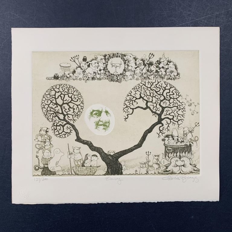 Charles Lynn Bragg's "Envy" limited edition print, signed lower right and numbered 139/300 lower left. This piece is of a few 'devilish' characters, surrounded a split tree. This piece is in excellent condition.