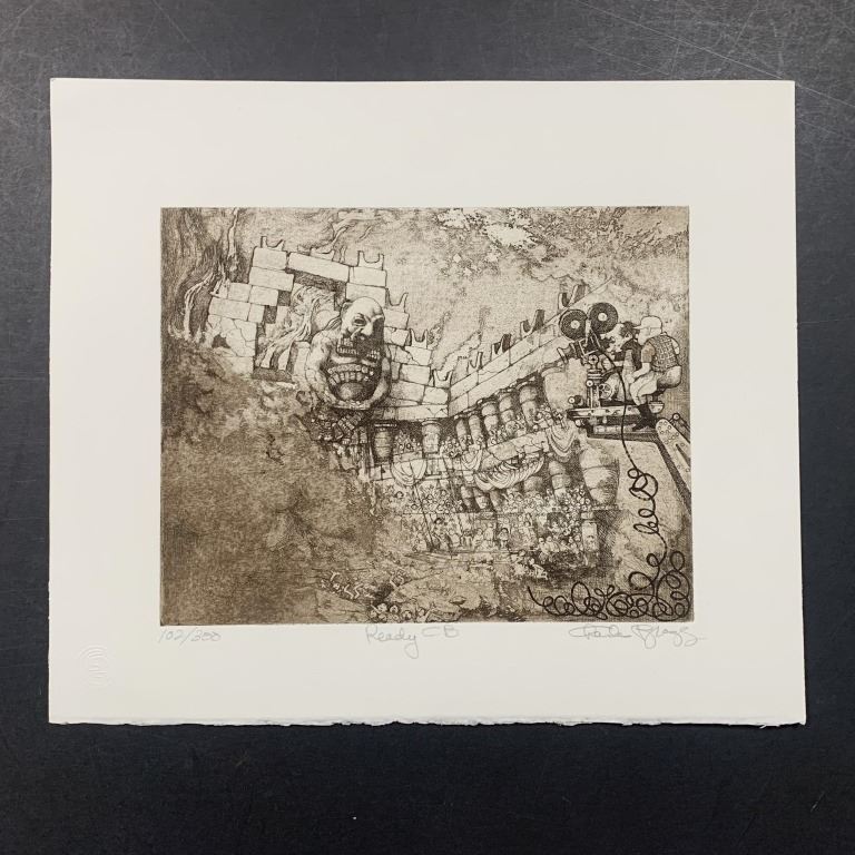 Charles Lynn Bragg's "Ready CB" limited edition print, signed lower right and numbered 102/300 lower left. This piece is of many people watching a very large gladiator, and there is a cameraman video recording it all happening. This piece is in excellent condition.