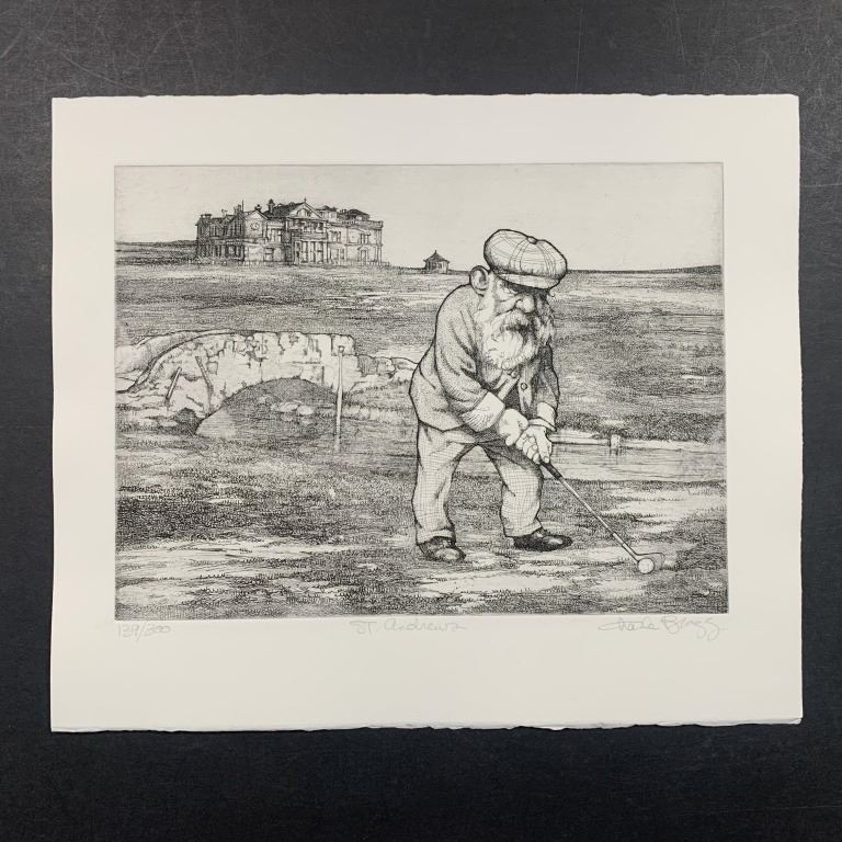 Charles Lynn Bragg's "St. Andrews" limited edition print, signed lower right and numbered 139/300 lower left. This piece is of an older man playing golf at The Old Course at St. Andrews. This piece is in excellent condition.