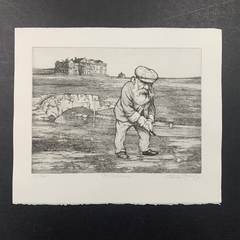 Charles Lynn Bragg's "St. Andrews" limited edition print, signed lower right and numbered 141/300 lower left. This piece is of an older man playing golf at The Old Course at St. Andrews. This piece is in excellent condition.