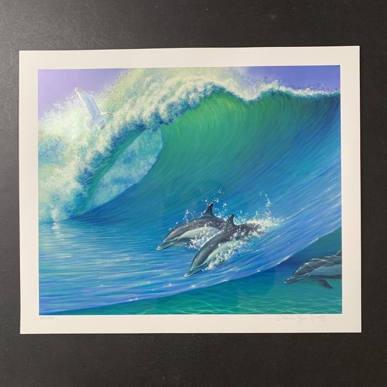 Charles Lynn Bragg's "Surfing Dolphins" limited edition print, signed lower right and numbered 197/900 lower left. This piece is of two dolphins 'riding a wave', with another dolphin in the water, and a seagul flying above. This piece is in excellent condition.