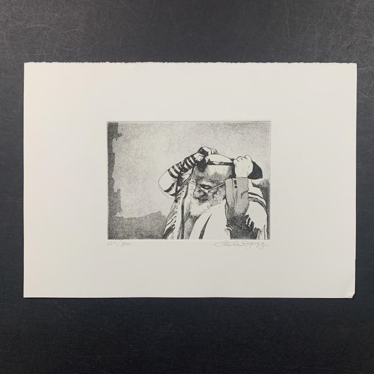 Charles Lynn Bragg's "Tefillin" limited edition print, signed lower right and numbered 124/300 lower left. This piece is of an elderly Jewish man, putting on tefillin. This piece is in excellent condition.