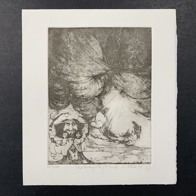 Charles Lynn Bragg's "The Almighty Friend" limited edition print, signed lower right and numbered 264/300 lower left. This piece is a man in the foreground holding a little voodoo doll of himself, which there is clearly a very poweful force in the sky. This piece is in excellent condition