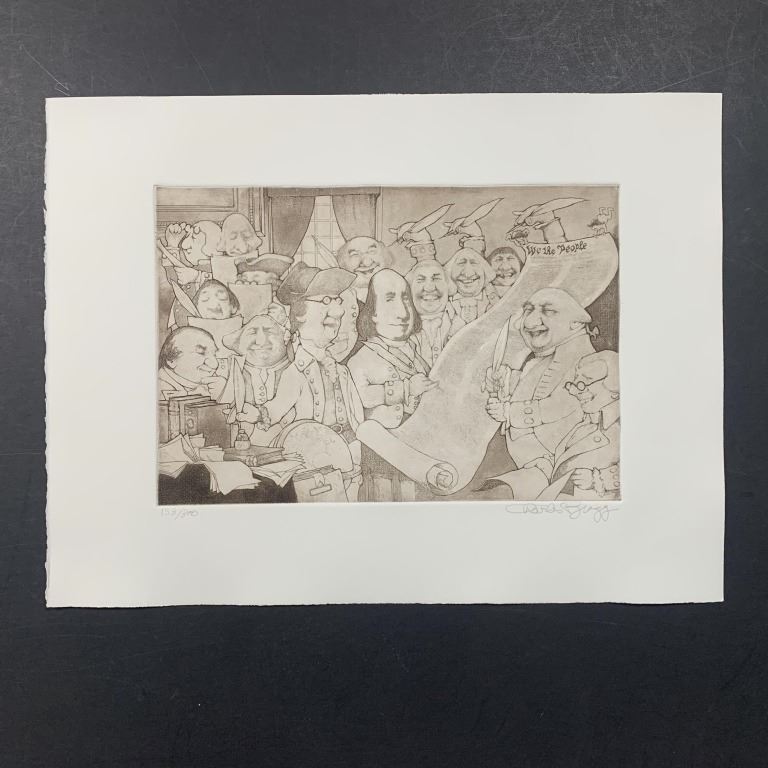 Charles Lynn Bragg's "The Founding Fathers" limited edition print, signed lower right and numbered 153/300 lower left. This piece is of the founding father signing the Declaration of Independence. This piece is in excellent condition.