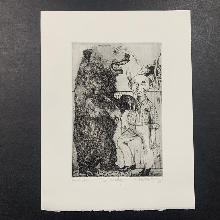 Charles Lynn Bragg's "The Trophy" limited edition print, signed lower right and numbered 266/300 lower left. This piece is of a hunter who is showing off his large taxidermied bear. This piece is in excellent condition.