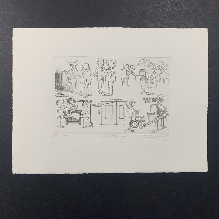 Charles Lynn Bragg's "The West Wing" limited edition print, signed lower right and numbered 246/300 lower left. This piece is of a few humurous depictions of scenes in a hospital. This piece is in excellent condition.