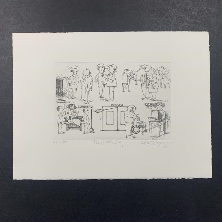 Charles Lynn Bragg's "The West Wing" limited edition print, signed lower right and numbered 247/300 lower left. This piece is of a few humurous depictions of scenes in a hospital. This piece is in excellent condition.