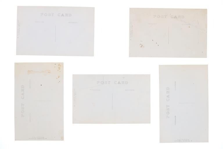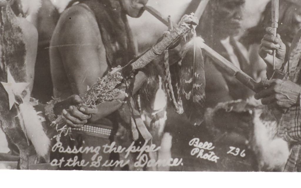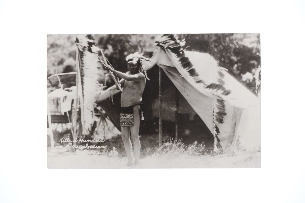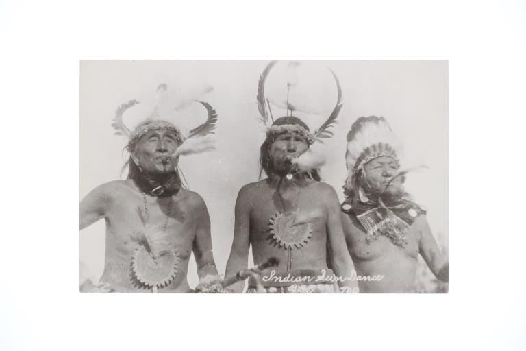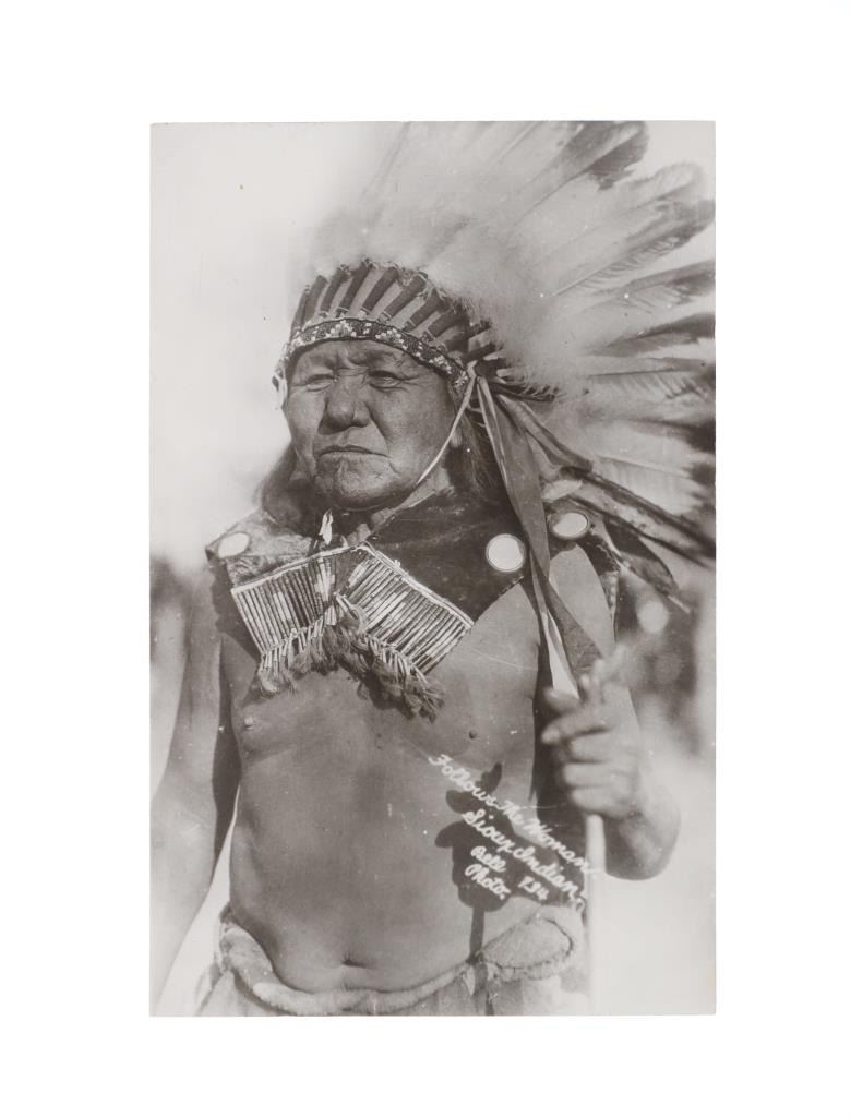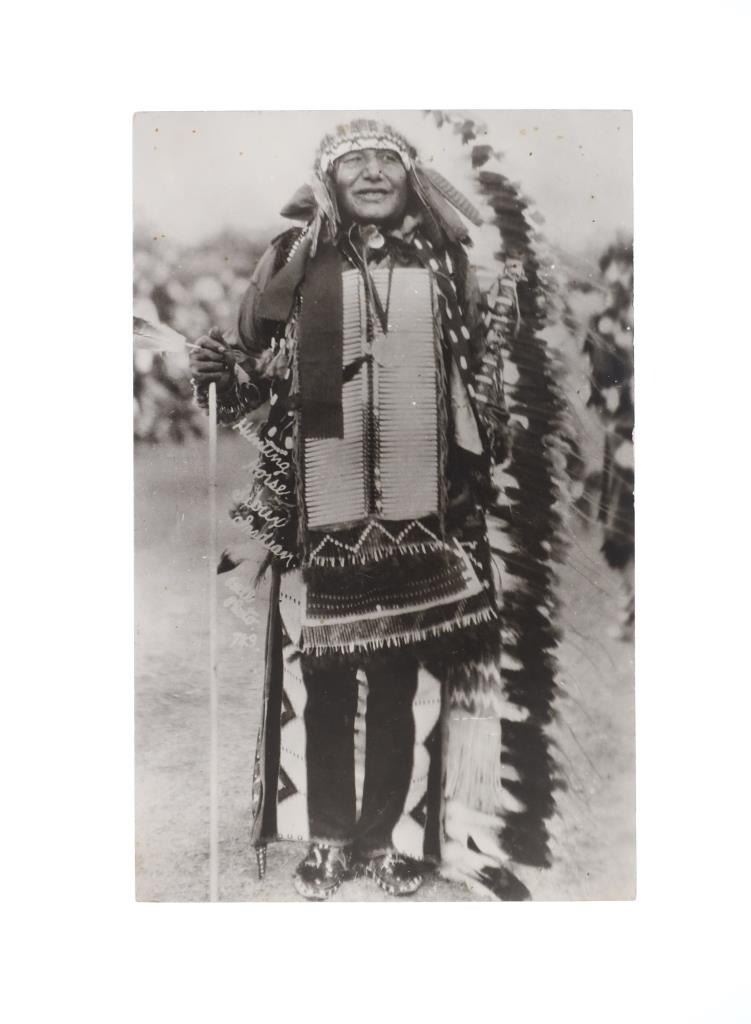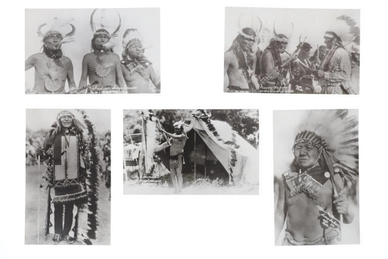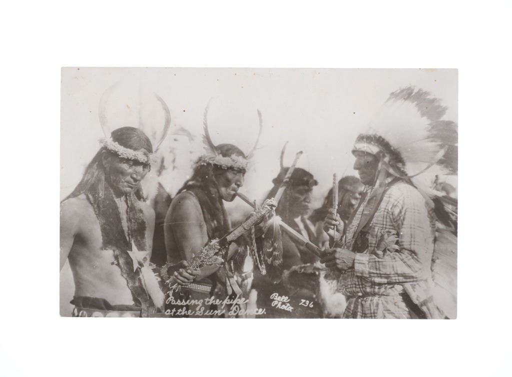 Featured in this lot are five real photo postcards of Sioux Native Americans taken by Charles Milton Bell circa 1870-1880s. Charles Milton Bell (1848-1893) was an American photographer who was noted for his portraits of Native Americans and other figures of the United States in the late 1800s. He was called "one of Washington's leading portrait photographers during the last quarter of the nineteenth century" by the Library of Congress. These photo postcards show a Sioux Sun Dance ceremony and shows various Sioux elders and a Sioux Chief doing different activities throughout the ceremony. The photos are titled "Passing the pipe at the Sun Dance (736)", "Indian Sun Dance (700)", "Kills A Hundred Sioux Indian (574)", "Hunting Horse Sioux Indian (743)", "Follows The Woman (734)". These photo postcards have not been used and show good condition overall with slight wear present from their age and handling over the years. They are set in plastic sleeves to preserve their condition. The photo postcards measure 5 3/8" L x 3 3/8" W, while the plastic sleeves measure 11 3/8" L x 8 3/8" W.