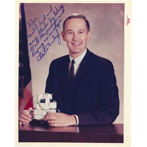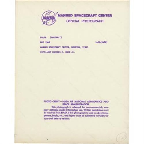 <B>Charles M. Duke Signed Color Photograph,</B></I> 8" x 10", "<I>To Joe,/ Best of luck and/ many thanks for taking/ off all the pounds and/ keeping me in shape./ Charlie Duke, Jr.</B></I>" As Apollo 16 Lunar Module pilot, Charlie Duke walked on the moon in 1972. <I>From the collection of renowned former physical trainer of the astronauts Joe Garino. This lot is accompanied by a signed certificate of authentication from Garino verifying its provenance.</B></I><BR><BR><b>Shipping:</b> Flat Material, Small (<a target="_blank" href="http://www.heritageauctions.com/common/shipping.php">view shipping information</a>)