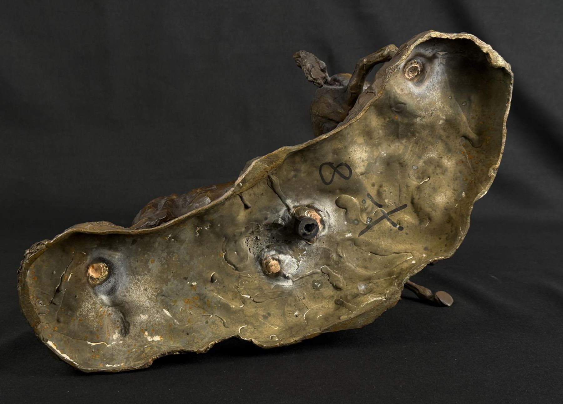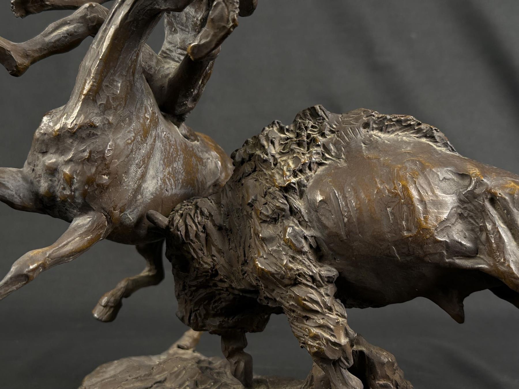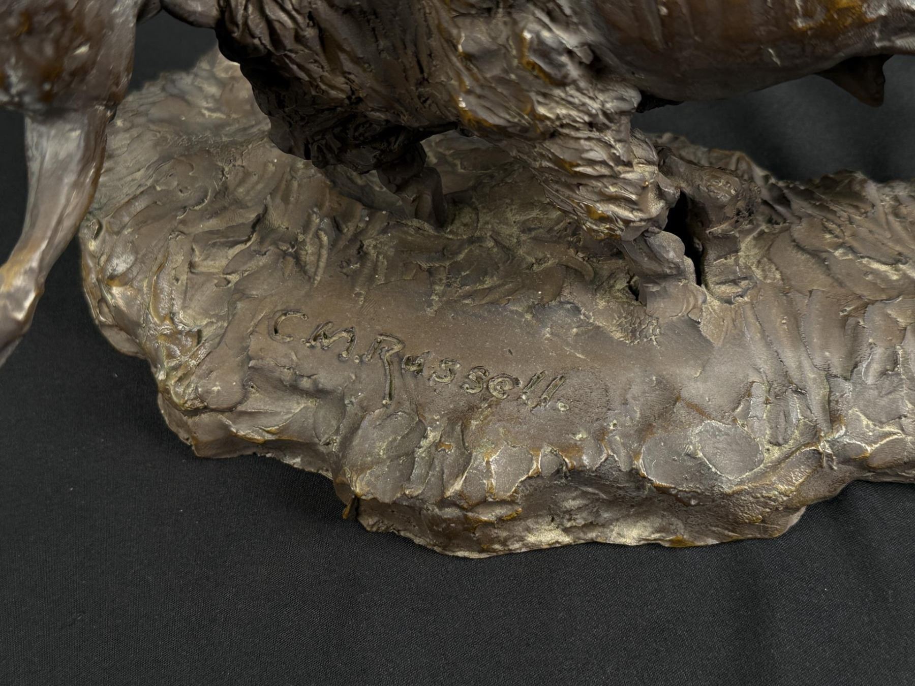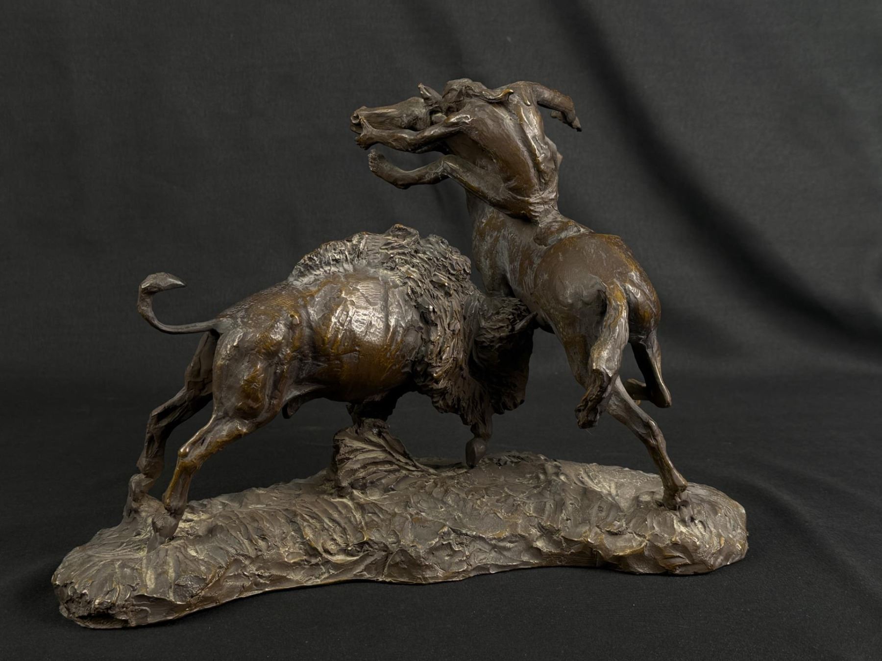 Title is Buffalo Hunt. 13 1/8" by 9" by 8 3/4". Charles Marion Russell (1864 - 1926) was active/lived in Montana, California, Missouri. Charles Russell is known for Indian-frontier genre painting, sculpture. Charles M. Russell, the nostalgic, held tight memories of a youthful past when the West belonged to God. There was a sense of loss, as poignant as losing a loved one. The specter of what this loss meant loomed over Russell the rest of his life. He was the quintessential nostalgic who grabbed history and married it to idealized memory and imagination. For example, despite Russell never witnessing a buffalo hunt, it became the basis for his most popular and desired art. Nancy Russell explained, "No man can be a painter without imagination." The Romantic art of the nineteenth century was the cornerstone to build the West reimagined for not only Russell, but also his contemporaries and future artists. No Western American artist fought back harder against racism, sexism, and championed environmentalism more than did Charles M. Russell. He thrived on imagining a time when the land was pristine, women were held in high regard, and people of color were the heroes. Paradoxically, the industrialized world championed just the opposite. To many, his life appeared odd—that cowboy hat, that sash, that unruly hair, that folksy talk. He and his art embraced an identity of an exile from a different place and time, which is even more appealing today. In that way, Russell was a visionary who instilled hope in all who saw his art, and his heart. For those reasons and much more, he is the most beloved of all the Western American artists. The Charles M. Russell Museum in Great Falls, Montana; the Charles M. Russell Center for the Study of Art of the American West at the University of Oklahoma in Norman; the Charles M. Russell Center Series on Art and Photography of the American West (books published by the University of Oklahoma University Press); the Charles M. Russell National Wildlife Refuge in Montana; the Russell Riders; and the Russell Skull Society are a testament to that fact. The Cowboy Artists of America have been called "The Sons of Charlie Russell" by art historian B. Byron Price for good reason. Russell was a legendary painter, sculptor, and author. Ever humble and self-effacing, as his fame skyrocketed, he never forgot his cowboy friends. The importance of his life and works is that no one has inspired more new generations of artists. Russell lived in the past and his wife Nancy who was his business manager lived for the future. How could a self-trained artist living in remote Montana become the highest paid artist in America? It’s quite a story. Charles Marion Russell was born on March 19, 1864 in St. Louis, Missouri, a bustling gateway to the West of some 200,000 people. Family history and adventure stories such as the Leatherstocking Tales by James Fenimore Cooper lured Russell to the West. On a crisp March day in 1880 Charles M. Russell jumped off the stagecoach in Helena, Montana Territory and took his turn as the latest easterner seeking western adventure. Accompanying him was Willis L.W. "Pike" Miller, a family acquaintance who acted as Russell’s guardian and gave him his first job in Montana on a sheep ranch Miller owned in the Judith Basin. While Miller was kind enough to chaperone Russell, they soon parted ways because Russell wanted nothing to do with sheepherding. For twelve years Russell and his horse Monte were together on the open range mainly nighthawking—somewhat of a lowly cowboy job of watching the horses overnight while the rest of the cowboys slept—until 1893 when Russell began transitioning from cowboy artist to full-time artist. Only a teenager, Russell was younger than most cowboys who were usually in their early twenties but shared with them the qualities of being gregarious, humble, energetic and adventuresome. Charlie saw the cowboy as the last frontiersman—unlike the colorless overburdened farmer and sheep herder. The period from 1906 to 1910 was one of the most productive and enjoyable times of Charlie’s life, which in no small part was due to the summers at Bull Head Lodge and the mentoring by others such as Philip R. Goodwin who visited him there in 1907 and 1910. Glacier National Park has the type of views that keep postcard publishers in business. The mountains fanned the flames of Charlie Russell’s creative genius. He understood that the mountains don’t need us, we need the mountains. Charlie’s favorite place in the world was the lodge, a log structure nestled among the cedar, fir, and tamarack along the shoreline of beautiful Lake McDonald. The years from 1911 to 1915 were a time of artistic achievement by Russell and promotion by Nancy who was as skilled as any field general with her well planned exhibitions in America, Canada, and England. It would be a grueling pace for the duo, but one that would yield a bountiful harvest of financial and critical success. The cowboy artist was "The West That Had Passed" in solid and photogenic form: strong, handsome, romantic, principled, loyal, productive and real. Nancy’s strategy was the same as any rodeo organizer: open the gates—which she did, and let ‘r buck— which Charlie much obliged. In 1911 Russell met with state officials regarding a mural that was planned for the new House of Representatives wing of the capitol. It would be the most important commission of his life. By July 1912 the twenty-five foot long Lewis and Clark Meeting Indians at Ross’ Hole was delivered to the capitol two months ahead of schedule and was instantly hailed as Russell’s masterpiece. The Minneapolis Sunday Journal summarized the sentiments around the country and wrote that it was "his best and most finished product." When the Russells arrived in California in February 1920 for their first winter there, the movie industry employed ten thousand people and was churning out hundreds of movies each year. Cha
