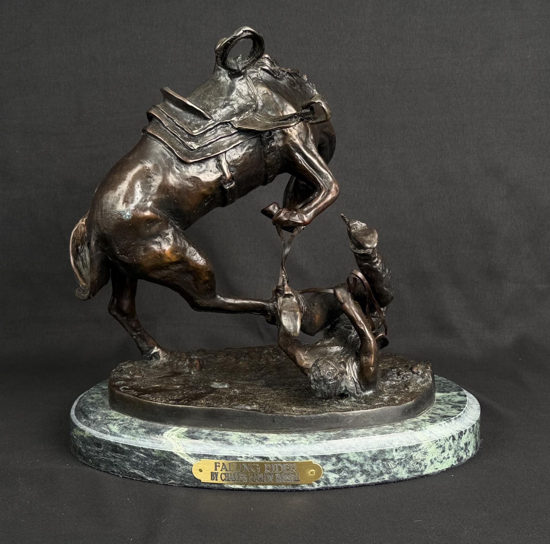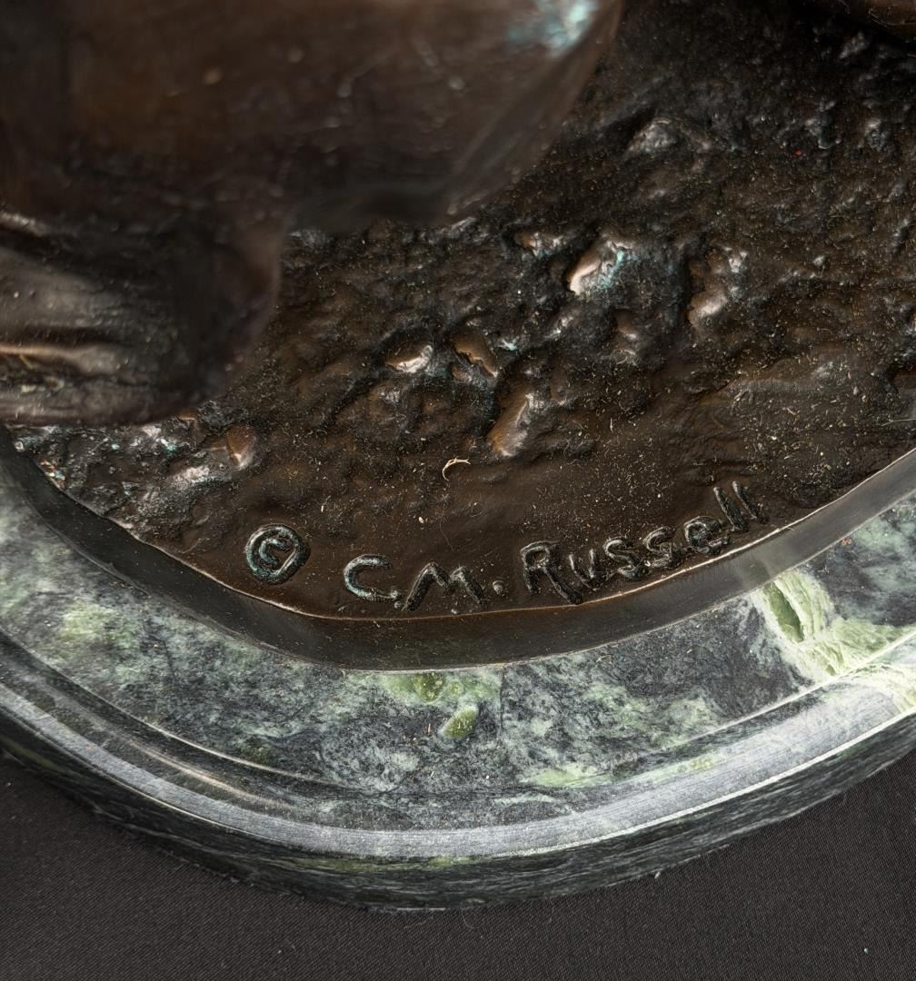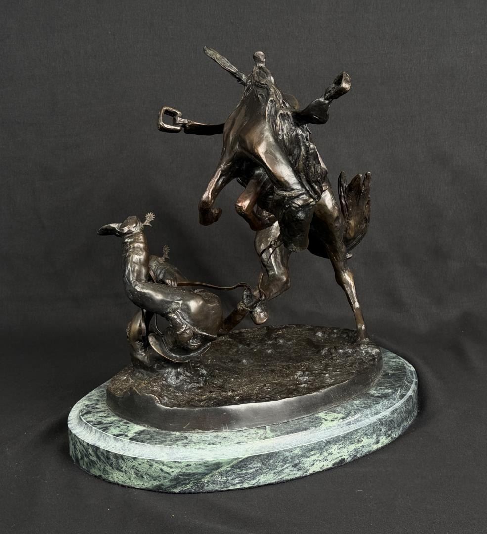 Title is Falling Rider. 12 1/2" by 12" by 9 7/8". Charles Marion Russell (1864 - 1926) was active/lived in Montana, California, Missouri. Charles Russell is known for Indian-frontier genre painting, sculpture. Charles M. Russell, the nostalgic, held tight memories of a youthful past when the West belonged to God. There was a sense of loss, as poignant as losing a loved one. The specter of what this loss meant loomed over Russell the rest of his life. He was the quintessential nostalgic who grabbed history and married it to idealized memory and imagination. For example, despite Russell never witnessing a buffalo hunt, it became the basis for his most popular and desired art. Nancy Russell explained, "No man can be a painter without imagination." The Romantic art of the nineteenth century was the cornerstone to build the West reimagined for not only Russell, but also his contemporaries and future artists. No Western American artist fought back harder against racism, sexism, and championed environmentalism more than did Charles M. Russell. He thrived on imagining a time when the land was pristine, women were held in high regard, and people of color were the heroes. Paradoxically, the industrialized world championed just the opposite. To many, his life appeared odd—that cowboy hat, that sash, that unruly hair, that folksy talk. He and his art embraced an identity of an exile from a different place and time, which is even more appealing today. In that way, Russell was a visionary who instilled hope in all who saw his art, and his heart. For those reasons and much more, he is the most beloved of all the Western American artists. The Charles M. Russell Museum in Great Falls, Montana; the Charles M. Russell Center for the Study of Art of the American West at the University of Oklahoma in Norman; the Charles M. Russell Center Series on Art and Photography of the American West (books published by the University of Oklahoma University Press); the Charles M. Russell National Wildlife Refuge in Montana; the Russell Riders; and the Russell Skull Society are a testament to that fact. The Cowboy Artists of America have been called "The Sons of Charlie Russell" by art historian B. Byron Price for good reason. Russell was a legendary painter, sculptor, and author. Ever humble and self-effacing, as his fame skyrocketed, he never forgot his cowboy friends. The importance of his life and works is that no one has inspired more new generations of artists. Russell lived in the past and his wife Nancy who was his business manager lived for the future. How could a self-trained artist living in remote Montana become the highest paid artist in America? It’s quite a story. Charles Marion Russell was born on March 19, 1864 in St. Louis, Missouri, a bustling gateway to the West of some 200,000 people. Family history and adventure stories such as the Leatherstocking Tales by James Fenimore Cooper lured Russell to the West. On a crisp March day in 1880 Charles M. Russell jumped off the stagecoach in Helena, Montana Territory and took his turn as the latest easterner seeking western adventure. Accompanying him was Willis L.W. "Pike" Miller, a family acquaintance who acted as Russell’s guardian and gave him his first job in Montana on a sheep ranch Miller owned in the Judith Basin. While Miller was kind enough to chaperone Russell, they soon parted ways because Russell wanted nothing to do with sheepherding. For twelve years Russell and his horse Monte were together on the open range mainly nighthawking—somewhat of a lowly cowboy job of watching the horses overnight while the rest of the cowboys slept—until 1893 when Russell began transitioning from cowboy artist to full-time artist. Only a teenager, Russell was younger than most cowboys who were usually in their early twenties but shared with them the qualities of being gregarious, humble, energetic and adventuresome. Charlie saw the cowboy as the last frontiersman—unlike the colorless overburdened farmer and sheep herder. The period from 1906 to 1910 was one of the most productive and enjoyable times of Charlie’s life, which in no small part was due to the summers at Bull Head Lodge and the mentoring by others such as Philip R. Goodwin who visited him there in 1907 and 1910. Glacier National Park has the type of views that keep postcard publishers in business. The mountains fanned the flames of Charlie Russell’s creative genius. He understood that the mountains don’t need us, we need the mountains. Charlie’s favorite place in the world was the lodge, a log structure nestled among the cedar, fir, and tamarack along the shoreline of beautiful Lake McDonald. The years from 1911 to 1915 were a time of artistic achievement by Russell and promotion by Nancy who was as skilled as any field general with her well planned exhibitions in America, Canada, and England. It would be a grueling pace for the duo, but one that would yield a bountiful harvest of financial and critical success. The cowboy artist was "The West That Had Passed" in solid and photogenic form: strong, handsome, romantic, principled, loyal, productive and real. Nancy’s strategy was the same as any rodeo organizer: open the gates—which she did, and let ‘r buck— which Charlie much obliged. In 1911 Russell met with state officials regarding a mural that was planned for the new House of Representatives wing of the capitol. It would be the most important commission of his life. By July 1912 the twenty-five foot long Lewis and Clark Meeting Indians at Ross’ Hole was delivered to the capitol two months ahead of schedule and was instantly hailed as Russell’s masterpiece. The Minneapolis Sunday Journal summarized the sentiments around the country and wrote that it was "his best and most finished product." When the Russells arrived in California in February 1920 for their first winter there, the movie industry employed ten thousand people and was churning out hundreds of movies each year. C