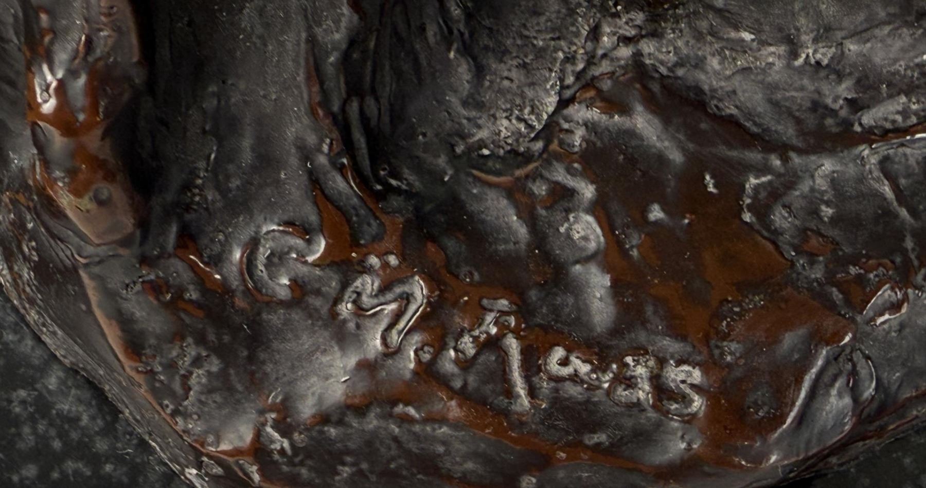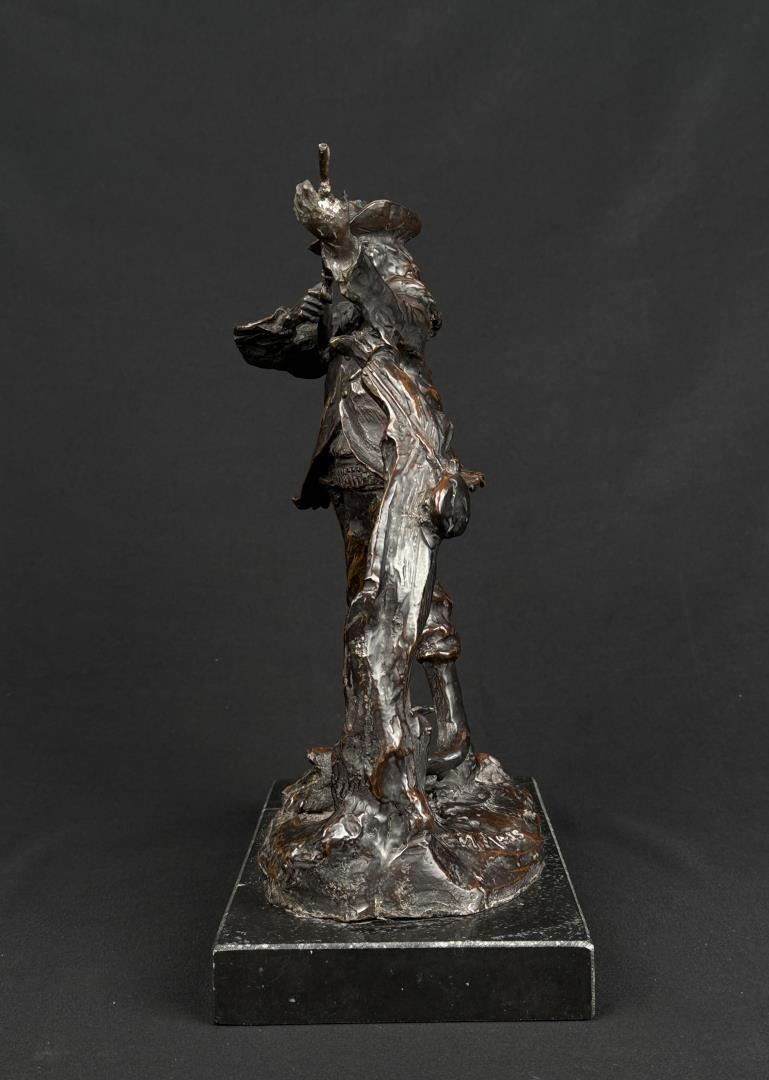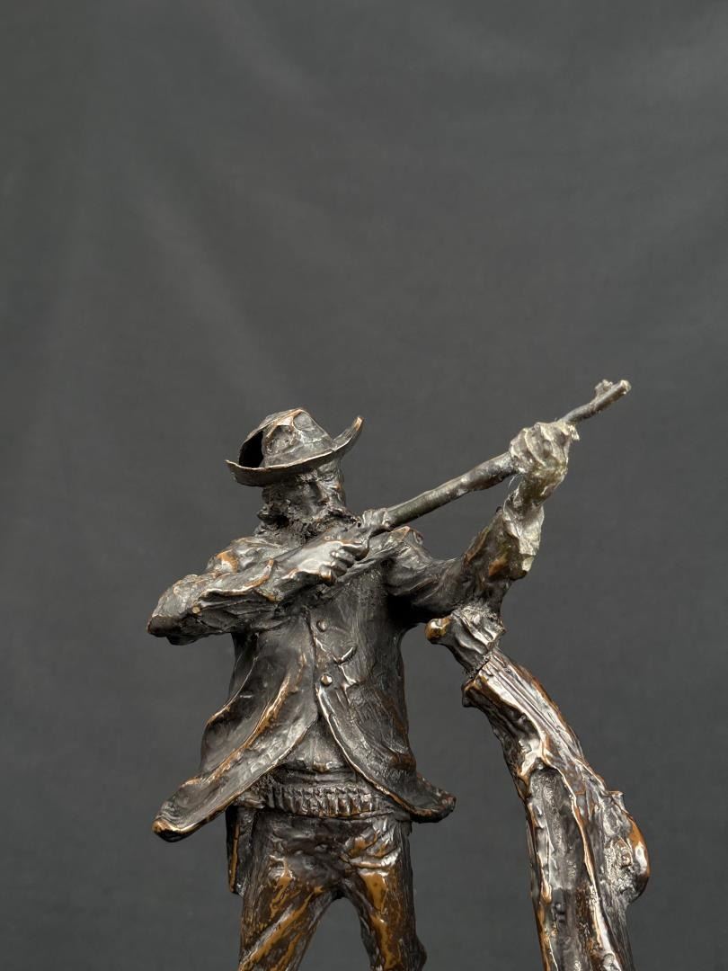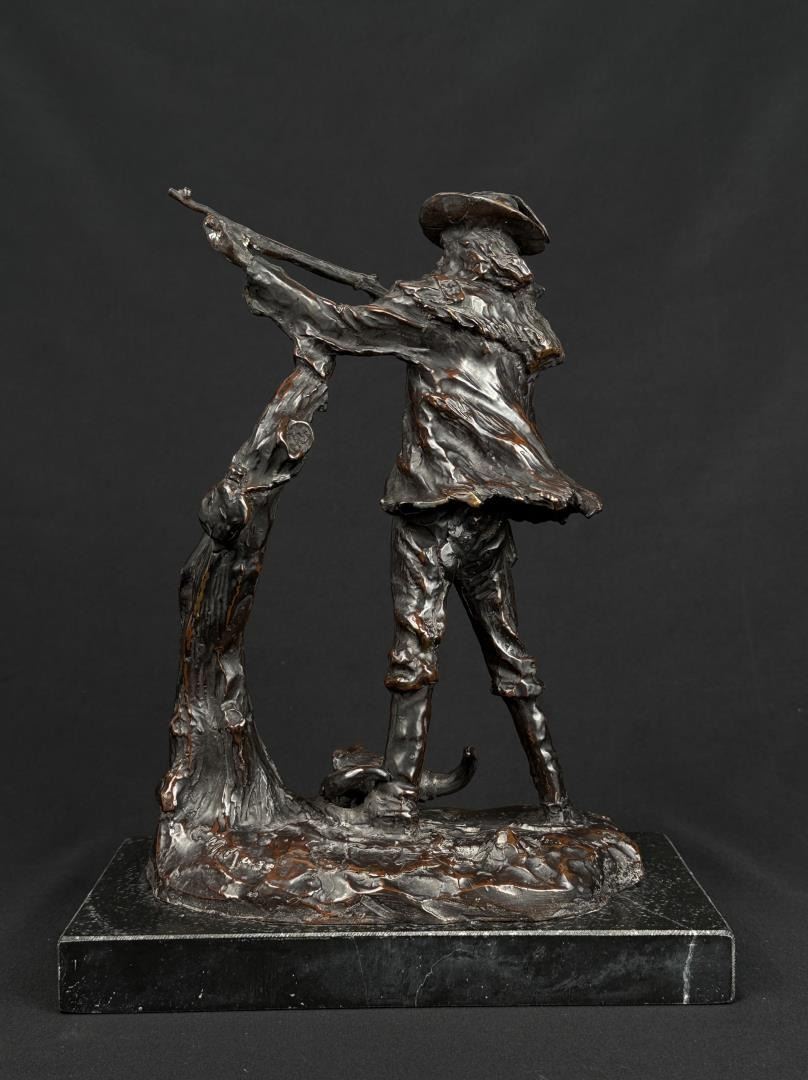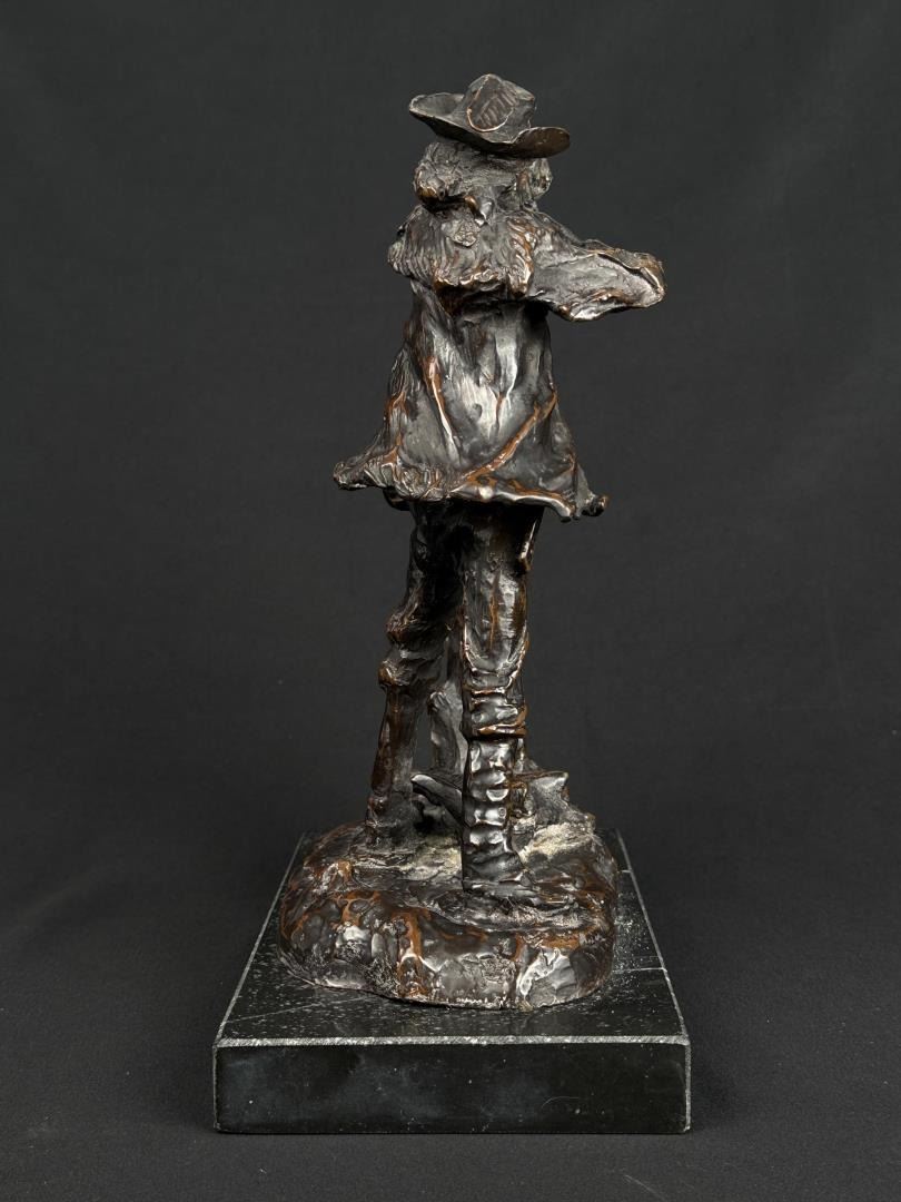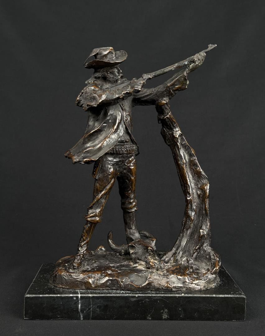 Title is Marksman. 11 1/4" by 9" by 5". Charles Marion Russell (1864 - 1926) was active/lived in Montana, California, Missouri. Charles Russell is known for Indian-frontier genre painting, sculpture. Charles M. Russell, the nostalgic, held tight memories of a youthful past when the West belonged to God. There was a sense of loss, as poignant as losing a loved one. The specter of what this loss meant loomed over Russell the rest of his life. He was the quintessential nostalgic who grabbed history and married it to idealized memory and imagination. For example, despite Russell never witnessing a buffalo hunt, it became the basis for his most popular and desired art. Nancy Russell explained, "No man can be a painter without imagination." The Romantic art of the nineteenth century was the cornerstone to build the West reimagined for not only Russell, but also his contemporaries and future artists. No Western American artist fought back harder against racism, sexism, and championed environmentalism more than did Charles M. Russell. He thrived on imagining a time when the land was pristine, women were held in high regard, and people of color were the heroes. Paradoxically, the industrialized world championed just the opposite. To many, his life appeared odd—that cowboy hat, that sash, that unruly hair, that folksy talk. He and his art embraced an identity of an exile from a different place and time, which is even more appealing today. In that way, Russell was a visionary who instilled hope in all who saw his art, and his heart. For those reasons and much more, he is the most beloved of all the Western American artists. The Charles M. Russell Museum in Great Falls, Montana; the Charles M. Russell Center for the Study of Art of the American West at the University of Oklahoma in Norman; the Charles M. Russell Center Series on Art and Photography of the American West (books published by the University of Oklahoma University Press); the Charles M. Russell National Wildlife Refuge in Montana; the Russell Riders; and the Russell Skull Society are a testament to that fact. The Cowboy Artists of America have been called "The Sons of Charlie Russell" by art historian B. Byron Price for good reason. Russell was a legendary painter, sculptor, and author. Ever humble and self-effacing, as his fame skyrocketed, he never forgot his cowboy friends. The importance of his life and works is that no one has inspired more new generations of artists. Russell lived in the past and his wife Nancy who was his business manager lived for the future. How could a self-trained artist living in remote Montana become the highest paid artist in America? It’s quite a story. Charles Marion Russell was born on March 19, 1864 in St. Louis, Missouri, a bustling gateway to the West of some 200,000 people. Family history and adventure stories such as the Leatherstocking Tales by James Fenimore Cooper lured Russell to the West. On a crisp March day in 1880 Charles M. Russell jumped off the stagecoach in Helena, Montana Territory and took his turn as the latest easterner seeking western adventure. Accompanying him was Willis L.W. "Pike" Miller, a family acquaintance who acted as Russell’s guardian and gave him his first job in Montana on a sheep ranch Miller owned in the Judith Basin. While Miller was kind enough to chaperone Russell, they soon parted ways because Russell wanted nothing to do with sheepherding. For twelve years Russell and his horse Monte were together on the open range mainly nighthawking—somewhat of a lowly cowboy job of watching the horses overnight while the rest of the cowboys slept—until 1893 when Russell began transitioning from cowboy artist to full-time artist. Only a teenager, Russell was younger than most cowboys who were usually in their early twenties but shared with them the qualities of being gregarious, humble, energetic and adventuresome. Charlie saw the cowboy as the last frontiersman—unlike the colorless overburdened farmer and sheep herder. The period from 1906 to 1910 was one of the most productive and enjoyable times of Charlie’s life, which in no small part was due to the summers at Bull Head Lodge and the mentoring by others such as Philip R. Goodwin who visited him there in 1907 and 1910. Glacier National Park has the type of views that keep postcard publishers in business. The mountains fanned the flames of Charlie Russell’s creative genius. He understood that the mountains don’t need us, we need the mountains. Charlie’s favorite place in the world was the lodge, a log structure nestled among the cedar, fir, and tamarack along the shoreline of beautiful Lake McDonald. The years from 1911 to 1915 were a time of artistic achievement by Russell and promotion by Nancy who was as skilled as any field general with her well planned exhibitions in America, Canada, and England. It would be a grueling pace for the duo, but one that would yield a bountiful harvest of financial and critical success. The cowboy artist was "The West That Had Passed" in solid and photogenic form: strong, handsome, romantic, principled, loyal, productive and real. Nancy’s strategy was the same as any rodeo organizer: open the gates—which she did, and let ‘r buck— which Charlie much obliged. In 1911 Russell met with state officials regarding a mural that was planned for the new House of Representatives wing of the capitol. It would be the most important commission of his life. By July 1912 the twenty-five foot long Lewis and Clark Meeting Indians at Ross’ Hole was delivered to the capitol two months ahead of schedule and was instantly hailed as Russell’s masterpiece. The Minneapolis Sunday Journal summarized the sentiments around the country and wrote that it was "his best and most finished product." When the Russells arrived in California in February 1920 for their first winter there, the movie industry employed ten thousand people and was churning out hundreds of movies each year. Charlie was