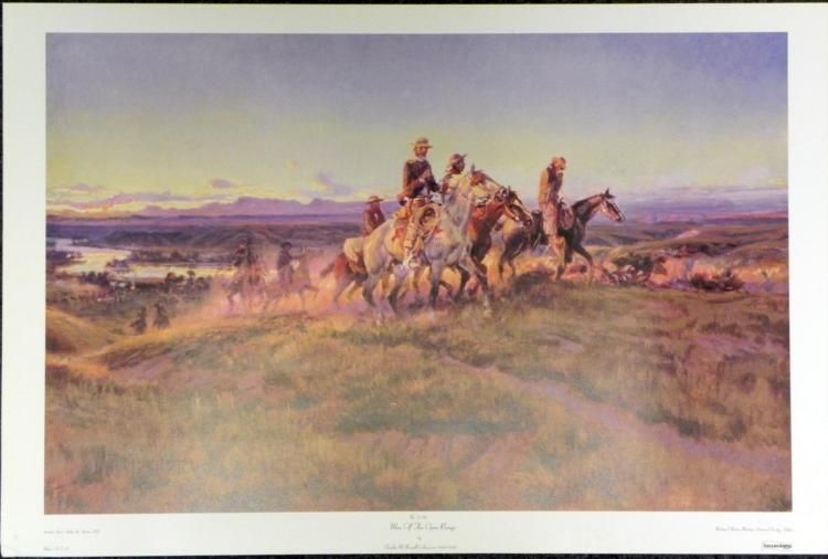 This print depicts the great expanse of the American West, and the men who call it their home. Artist: Charles M. Russell Title: The Men of the Open Range Medium: Collograph print on paperSheet size: 34 1/2 x 23 inchesCondition: Excellent; minor corner