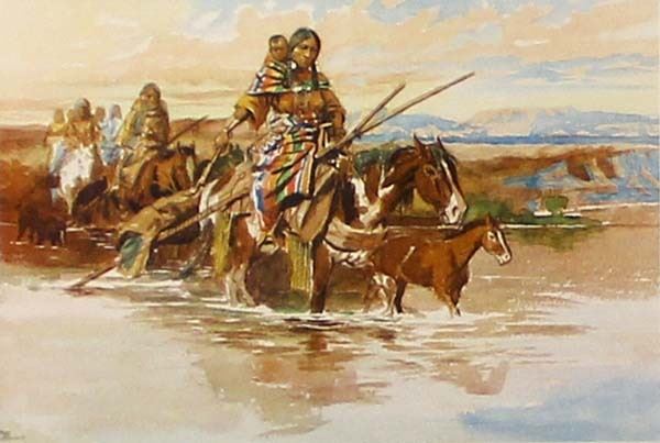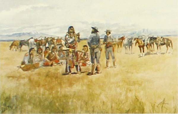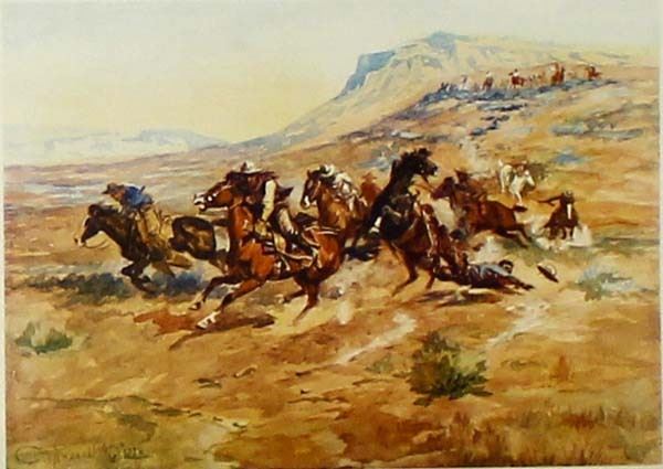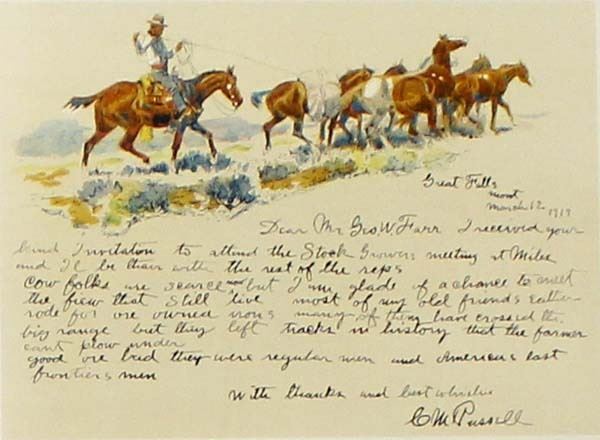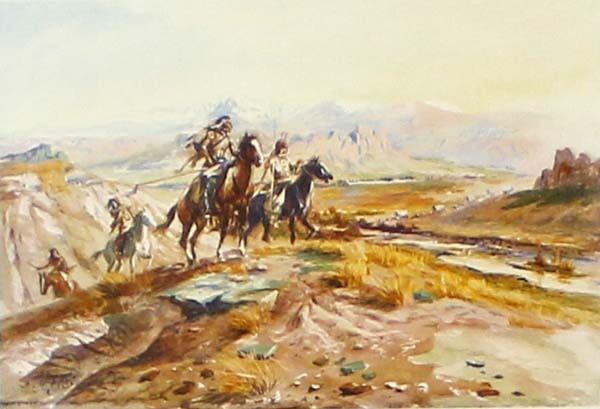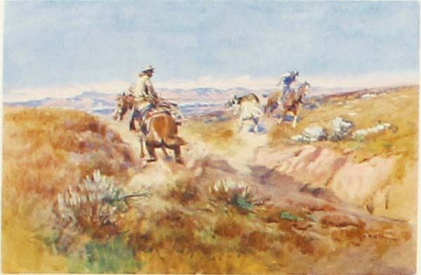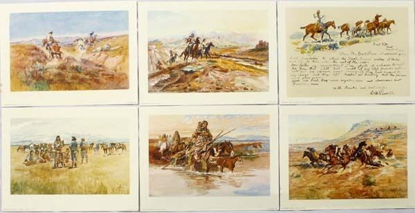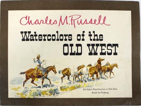 Charles M. Russell Watercolors of the Old West Prints Folio, Six Superb Reproductions in Full Color, Ready for Framing, includes Indians and Scouts Talking, Squaw Travois, Surprise Attack, When Cows Were Wild, Intruders, Letter to Geo. W. Farr, c. 1958 Penn Press, prints measure 16'' x 12'', folio measures 16'' x 12''