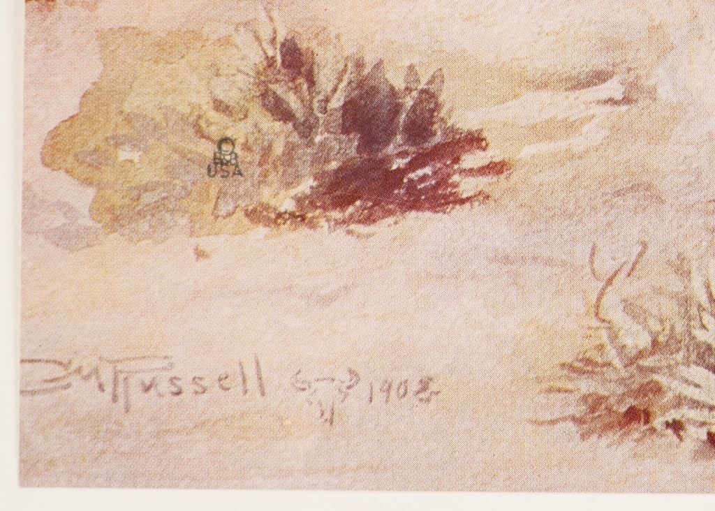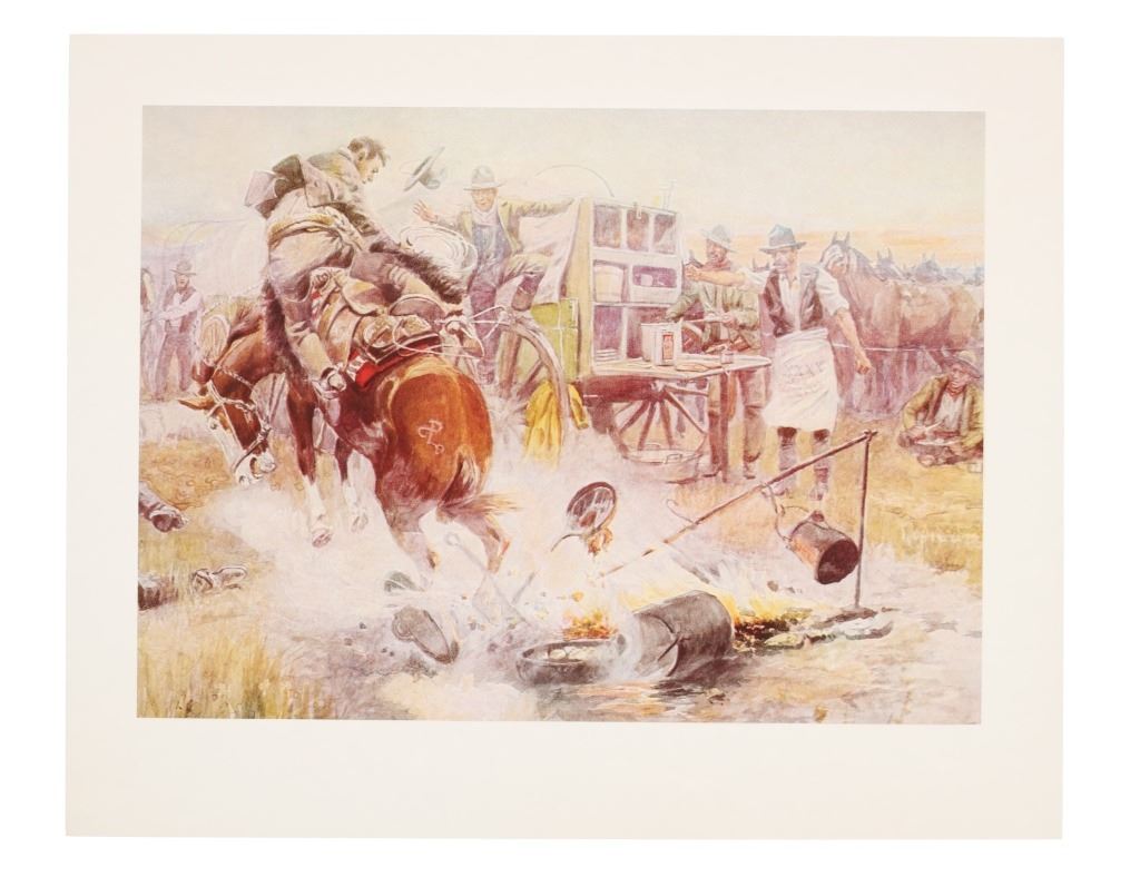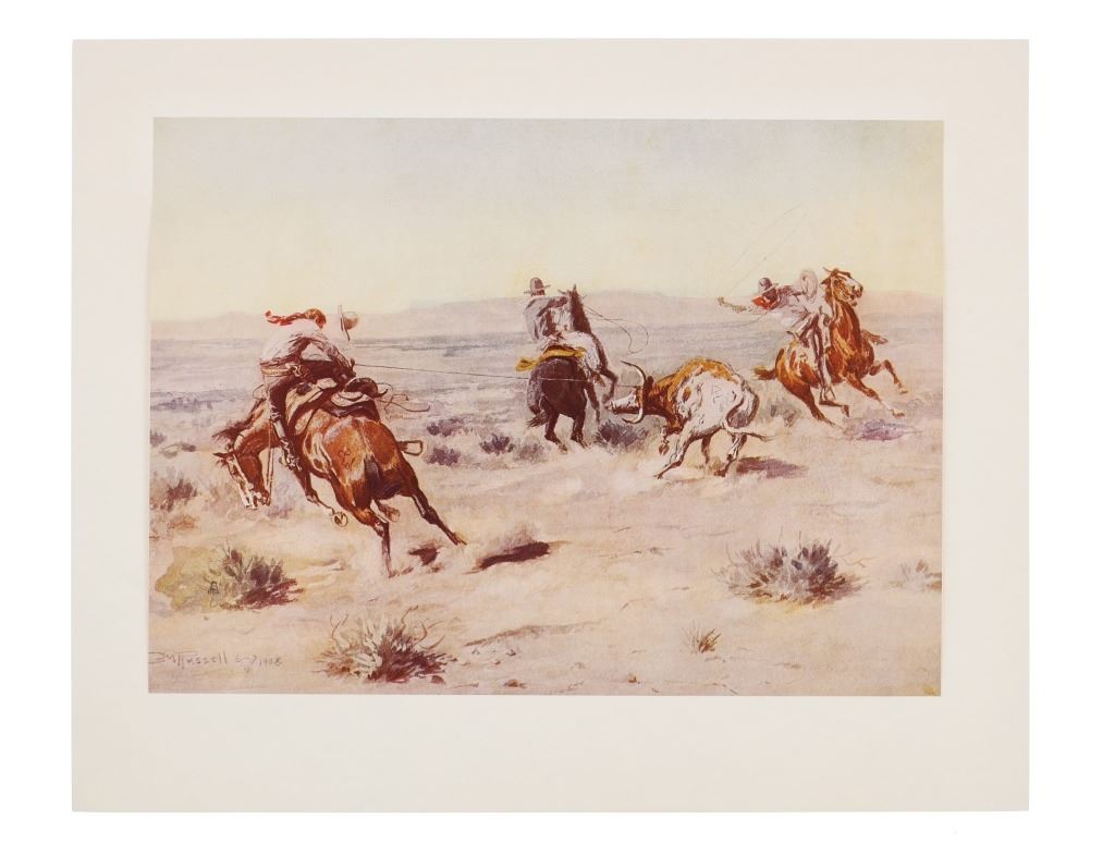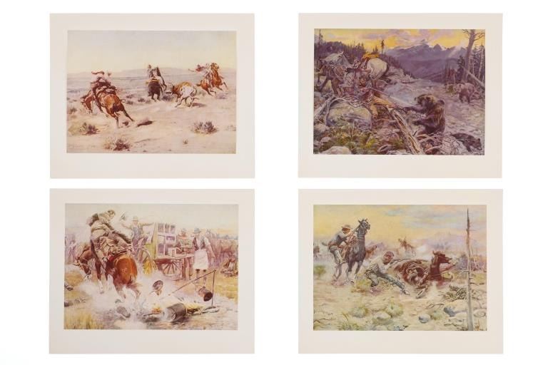 For your consideration are four Charles M. Russell prints for framing, printed by B & B circa 1960-70s. Charles Marion Russell, also known as C. M. Russell, Charlie Russell, and "Kid" Russell, was an American artist of the American Old West. He created more than 2,000 paintings of cowboys, Native Americans, and landscapes set in the western United States and in Alberta, Canada, in addition to bronze sculptures. The four lots included in this are titled, "A Bronc to Breakfast", "At Close Quarters", "When Horse Flesh Comes High" and "A Loose Cinch". The first print "A Bronc to Breakfast" shows cowboys and ranchers watching a cowboy on his horse buck him around the cooking area as he kicks over the meal that was just prepared. The second print, "At Close Quarters" depicts a man protecting himself and his horses as two bears charge at him in close quarters. The man has his rifle raised and has shot at the closet bear to him, while his horses get ready to flee. The third print, "When Horse Flesh Comes High" shows a group of cowboys in a fire fight with unknown enemies. One man is hoping onto his horse, while the other is firing his rifle behind his downed horse. The final print, "A Loose Cinch" shows three cowboys wrangling a large bull on horseback. One man has his rope tied on the horns of the bull, while the other two swing their ropes in the air ready to wrangle the bull. The four ready to frame prints come with a small write up on Charles M. Russell as well. The prints and write up show good condition overall with no wear present. The visible art measures 7 13/16" L x 10 3/4" W, while the entire piece measures 10 1/2" L x 13" W.