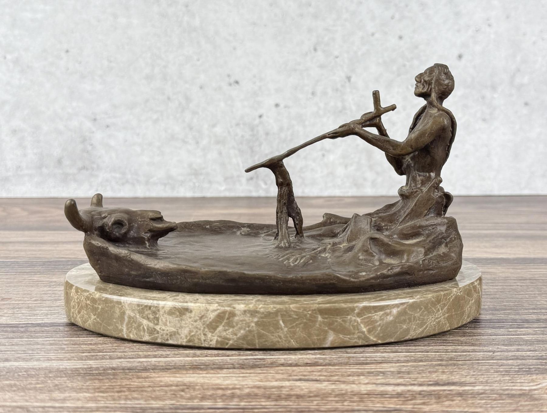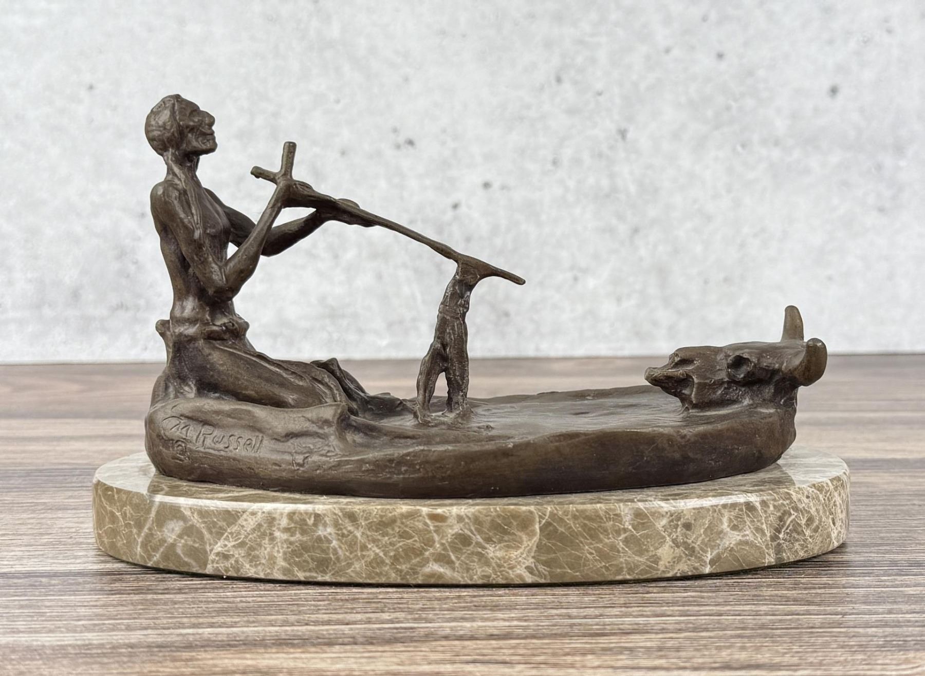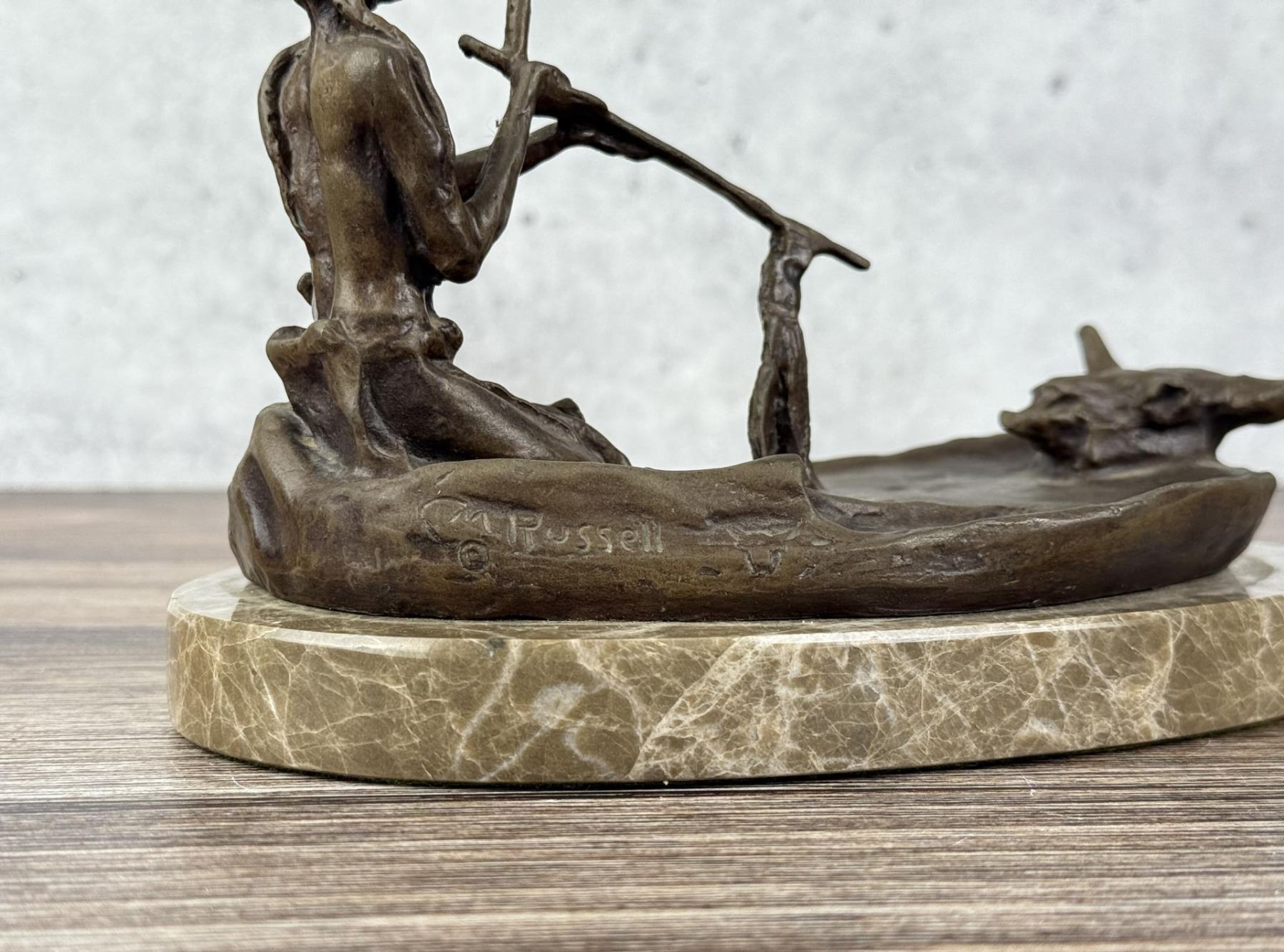Title is Spirit of the Buffalo. 8 5/8" by 5 3/4" by 5". Charles Marion Russell (1864 - 1926) was active/lived in Montana, California, Missouri. Charles Russell is known for Indian-frontier genre painting, sculpture. Charles M. Russell, the nostalgic, held tight memories of a youthful past when the West belonged to God. There was a sense of loss, as poignant as losing a loved one. The specter of what this loss meant loomed over Russell the rest of his life. He was the quintessential nostalgic who grabbed history and married it to idealized memory and imagination. For example, despite Russell never witnessing a buffalo hunt, it became the basis for his most popular and desired art. Nancy Russell explained, "No man can be a painter without imagination." The Romantic art of the nineteenth century was the cornerstone to build the West reimagined for not only Russell, but also his contemporaries and future artists. No Western American artist fought back harder against racism, sexism, and championed environmentalism more than did Charles M. Russell. He thrived on imagining a time when the land was pristine, women were held in high regard, and people of color were the heroes. Paradoxically, the industrialized world championed just the opposite. To many, his life appeared odd—that cowboy hat, that sash, that unruly hair, that folksy talk. He and his art embraced an identity of an exile from a different place and time, which is even more appealing today. In that way, Russell was a visionary who instilled hope in all who saw his art, and his heart. For those reasons and much more, he is the most beloved of all the Western American artists. The Charles M. Russell Museum in Great Falls, Montana; the Charles M. Russell Center for the Study of Art of the American West at the University of Oklahoma in Norman; the Charles M. Russell Center Series on Art and Photography of the American West (books published by the University of Oklahoma University Press); the Charles M. Russell National Wildlife Refuge in Montana; the Russell Riders; and the Russell Skull Society are a testament to that fact. The Cowboy Artists of America have been called "The Sons of Charlie Russell" by art historian B. Byron Price for good reason. Russell was a legendary painter, sculptor, and author. Ever humble and self-effacing, as his fame skyrocketed, he never forgot his cowboy friends. The importance of his life and works is that no one has inspired more new generations of artists. Russell lived in the past and his wife Nancy who was his business manager lived for the future. How could a self-trained artist living in remote Montana become the highest paid artist in America? It’s quite a story. Charles Marion Russell was born on March 19, 1864 in St. Louis, Missouri, a bustling gateway to the West of some 200,000 people. Family history and adventure stories such as the Leatherstocking Tales by James Fenimore Cooper lured Russell to the West. On a crisp March day in 1880 Charles M. Russell jumped off the stagecoach in Helena, Montana Territory and took his turn as the latest easterner seeking western adventure. Accompanying him was Willis L.W. "Pike" Miller, a family acquaintance who acted as Russell’s guardian and gave him his first job in Montana on a sheep ranch Miller owned in the Judith Basin. While Miller was kind enough to chaperone Russell, they soon parted ways because Russell wanted nothing to do with sheepherding. For twelve years Russell and his horse Monte were together on the open range mainly nighthawking—somewhat of a lowly cowboy job of watching the horses overnight while the rest of the cowboys slept—until 1893 when Russell began transitioning from cowboy artist to full-time artist. Only a teenager, Russell was younger than most cowboys who were usually in their early twenties but shared with them the qualities of being gregarious, humble, energetic and adventuresome. Charlie saw the cowboy as the last frontiersman—unlike the colorless overburdened farmer and sheep herder. The period from 1906 to 1910 was one of the most productive and enjoyable times of Charlie’s life, which in no small part was due to the summers at Bull Head Lodge and the mentoring by others such as Philip R. Goodwin who visited him there in 1907 and 1910. Glacier National Park has the type of views that keep postcard publishers in business. The mountains fanned the flames of Charlie Russell’s creative genius. He understood that the mountains don’t need us, we need the mountains. Charlie’s favorite place in the world was the lodge, a log structure nestled among the cedar, fir, and tamarack along the shoreline of beautiful Lake McDonald. The years from 1911 to 1915 were a time of artistic achievement by Russell and promotion by Nancy who was as skilled as any field general with her well planned exhibitions in America, Canada, and England. It would be a grueling pace for the duo, but one that would yield a bountiful harvest of financial and critical success. The cowboy artist was "The West That Had Passed" in solid and photogenic form: strong, handsome, romantic, principled, loyal, productive and real. Nancy’s strategy was the same as any rodeo organizer: open the gates—which she did, and let ‘r buck— which Charlie much obliged. In 1911 Russell met with state officials regarding a mural that was planned for the new House of Representatives wing of the capitol. It would be the most important commission of his life. By July 1912 the twenty-five foot long Lewis and Clark Meeting Indians at Ross’ Hole was delivered to the capitol two months ahead of schedule and was instantly hailed as Russell’s masterpiece. The Minneapolis Sunday Journal summarized the sentiments around the country and wrote that it was "his best and most finished product." When the Russells arrived in California in February 1920 for their first winter there, the movie industry employed ten thousand people and was churning out hundreds of movies each y