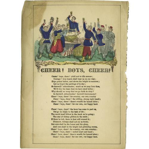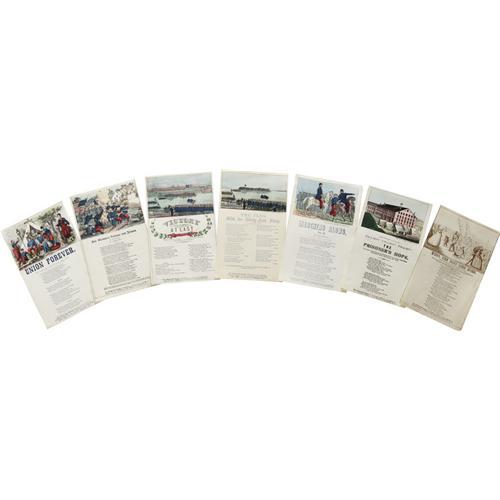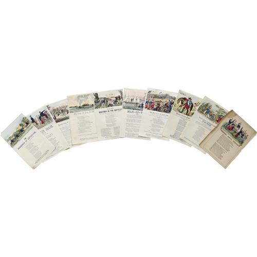 <B>Charles Magnus Civil War Songsheets</B></I> A collection of 17 Union patriotic songsheets published by Charles Magnus of New York. Each sheet is one page, 5" x 8", and, with one brown ink exception, each carries a color lithograph above the song's lyrics. Titles include, "When The Boys Come Home", "Tramp! Tramp! Tramp! The Prisoner's Hope", "Marching Along" (2 copies), "The Flag With the Thirty-Four Stars", "Victory At Last", "How Sherman's Veterans Took Atlanta", "Union Forever", "The Army and Navy Forever", A Yankee Man-of-War", "Was My Brother in the Battle?", "Mother Kissed Me in My Dream", "My Love is on the Battle Field", "The Battle-Cry of Freedom", "Mother, Dearest, I am Coming", "The Drummer of Antietam", and "Cheer, Boys, Cheer!". One sheet is double-printed and all have minor stains. Overall very good condition.
