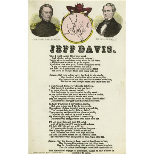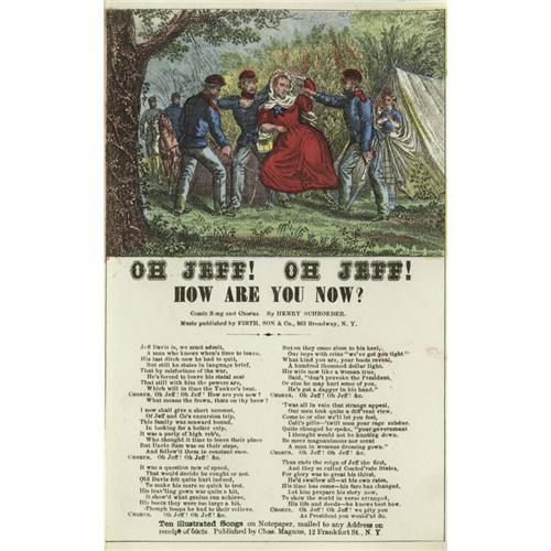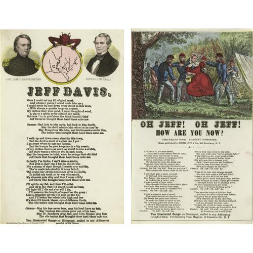 <B>Charles Magnus Jefferson Davis Songsheets.</B></I> Confederate President Jefferson Davis was a convenient target for Northern derision and was subject to derogatory media attacks of every conceivable type. Here the celebrated New York publisher Charles Magnus capitalizes on Jeff's infamy with two commercial songsheets having color lithographs. Both sheets are from the Henry E. Luhrs Collection and are as follows: <BR><B>"Jeff Davis",</B></I> one page, 5" x 8". This early war song dominates the front of a four-page piece of lined stationery. Portraits of Davis and John C. Breckenridge flank a circular map of the Confederacy held by a grinning red devil. Very fine condition with only the slightest soiling and a crease on one corner <BR><B>"Oh Jeff! Oh Jeff! How Are You Now?",</B></I> one page, 5" x 8". On May 10, 1865 a fleeing Davis was captured near Irwinville, Georgia. False rumor that he was attempting to evade capture by wearing female clothing gave rise to a popular myth no doubt fueled by sheets such as this example. Here Davis, in mythical drag, is surrounded by Union cavalrymen as his final wartime drama plays out. Crisp and extra fine condition.