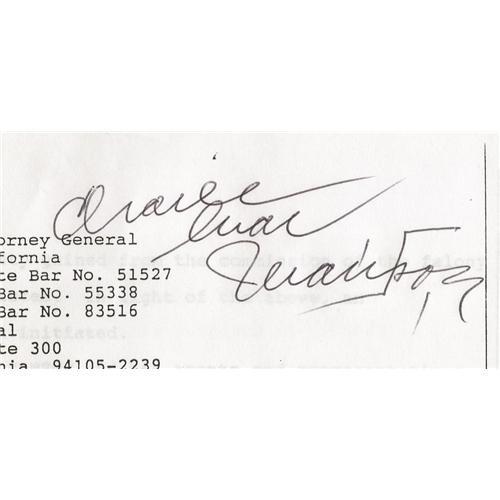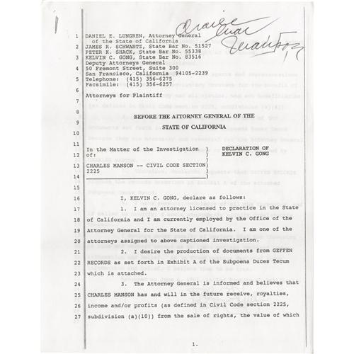 <B>Charles Manson Signed Court Declaration.</B></I> This copy of a six-page legal document, executed June 6, 1995, in San Francisco, serves this purpose: "The Attorney General is informed and believes that Charles Manson had and will in the future receive, royalties, income and/or profits (as defined in Civil Code section 2225, subdivision (a) (10) from the sale of rights, the value of which is enhanced by notoriety gained from the commission of the felony for which he was convicted." The document notes that "Manson and his agents and representatives hold all such income as involuntary trustees for the benefit of the family members of any and all victims, who are beneficiaries," and calls for an investigation, notably of Geffen Records, for whom Guns 'N Roses had recorded Manson's song "The Spaghetti Incident," written in the 1960s. Manson has signed this copy boldly and in black ink in the upper right area of the first page. This document exemplifies of the legalities still spawning over a quarter-century after the most spine-chilling murders in U.S history.<BR><BR><b>Shipping:</b> Other (oversized items, group lo (<a target="_blank" href="http://www.heritageauctions.com/common/shipping.php">view shipping information</a>)