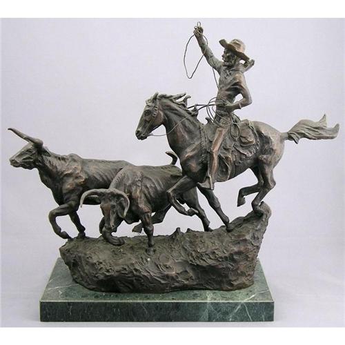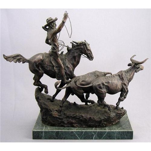 American [1864-1926] ROUND UP Bronze, set on a marble base 13.25 x 16.5 x 5.5 in. (33.7 x 41.9 x 14 cm) signed "C. M. Russell" and with trademark steer skull Note: Posthumous Cast