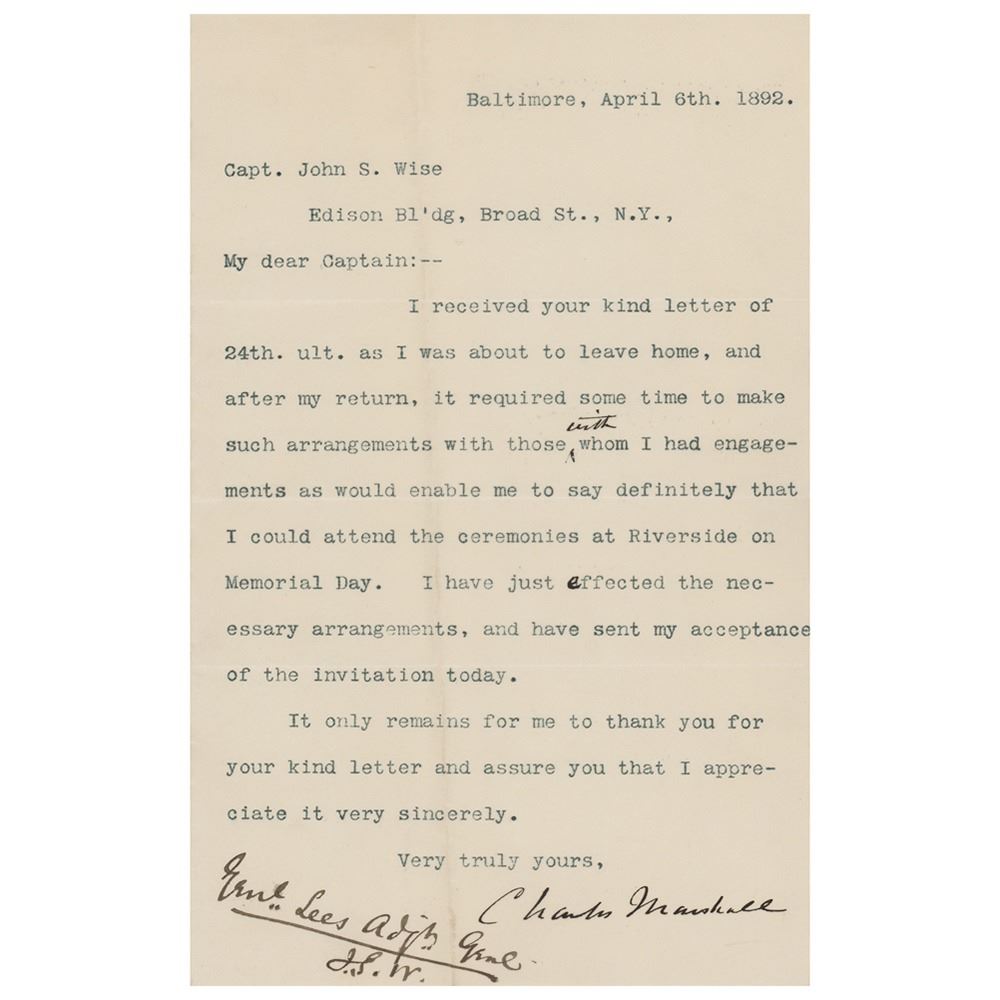 Aide-de-camp to Robert E. Lee during the Civil War (1830-1902) and author of General Order No. 9, Lee's famous farewell address. TLS, one page, 5 x 8, April 6, 1892. Written from Baltimore, a letter to Captain John Sergeant Wise, in full: "I received your kind letter of 24th. ult. as I was about to leave home, and after my return, it required some time to make such arrangements with those with whom I had engagements as would enable me to say definitely that I could attend the ceremonies at Riverside on Memorial Day. I have just effected the necessary arrangements, and have sent my acceptance of the invitation today. It only remains for me to thank you for your kind letter and assure you that I appreciate it very sincerely." The lower portion appears to be annotated and initialed by Wise. In fine condition. Accompanied by the original War Department envelope.