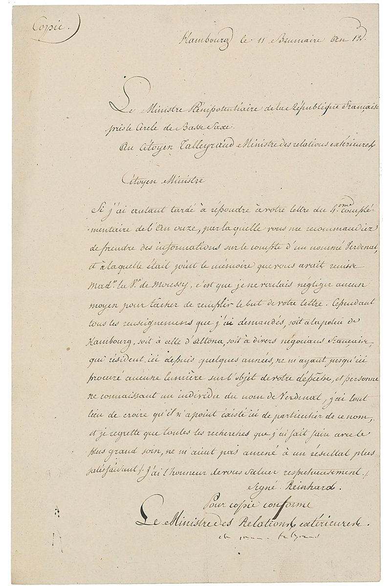 Highly skilled and influential diplomat (1754–1838) who served the French government from the reign of Louis XVI through that of Louis-Philippe, the last King of France. In the month-long period between the fall of Napoleon and the return of Louis XVIII in early 1814, Talleyrand headed the provisional government of France, making him, if only briefly, the most powerful man in the nation. Untranslated manuscript DS, in French, signed “Ch. Mau. Talleyrand,” one page, 7.75 x 12.25, 11 Brumaire au 12 (November 3, 1803), signed at the conclusion by Talleyrand as minister of foreign affairs. In fine condition.