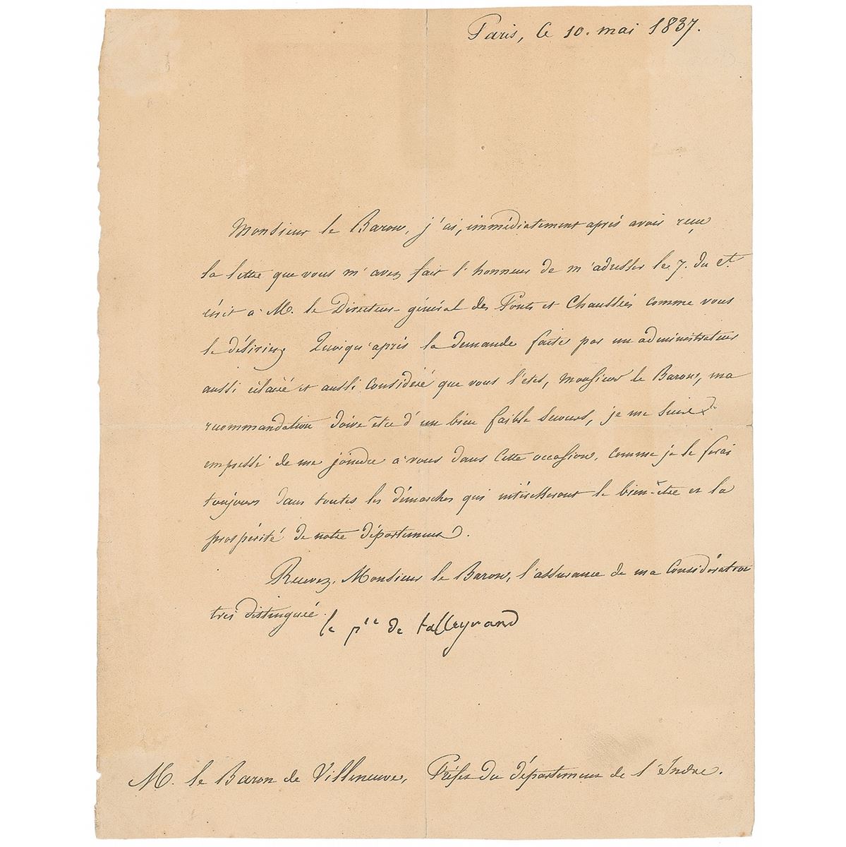 Highly skilled and influential diplomat (1754–1838) who served the French government from the reign of Louis XVI through that of Louis-Philippe. LS in French, signed “le pce de Talleyrand,” one page, 7.25 x 9.25, May 10, 1837. Untranslated letter to Baron de Villeneuve, whose request to the director general of bridges and roads he had forwarded. Central vertical and horizontal folds with partial tape-repaired edge separations, various light blocks of toning and show-through from adhesive remnants to reverse, and mild soiling, otherwise fine condition. Accompanied by an unsigned engraved portrait.