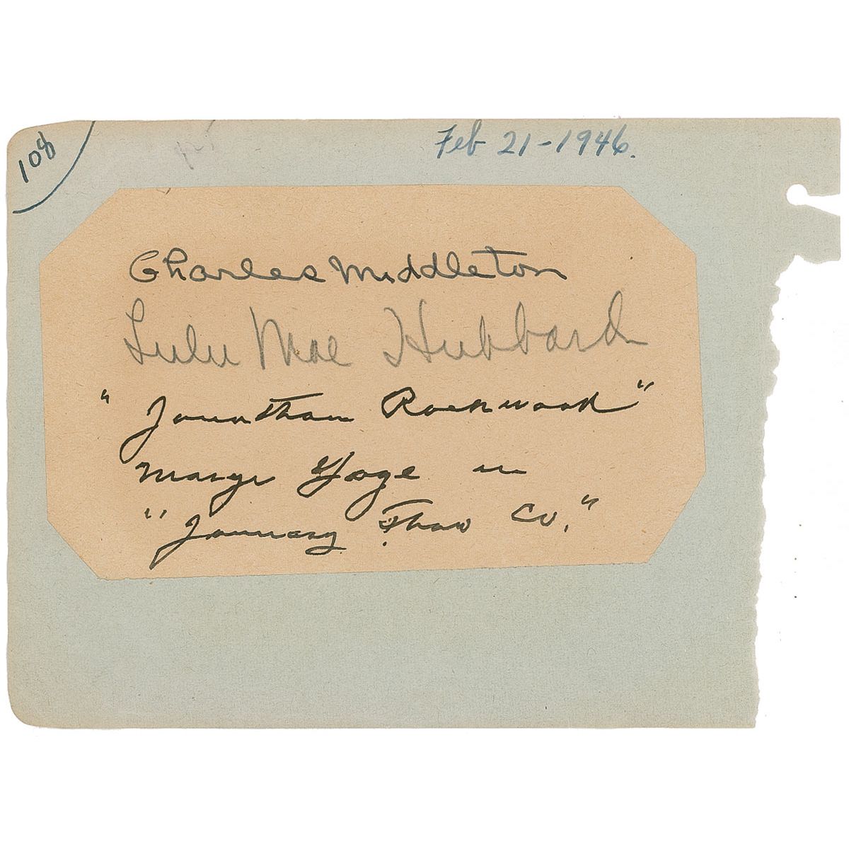 Best remembered as Emperor Ming the Merciless in the famous Flash Gordon serials. Vintage fountain pen signature, “Charles Middleton,” on an off-white 4.75 x 2.75 album page affixed to a slightly larger album page, dated February 21, 1946, in another hand, also featuring the signatures of Lulu Mae Hubbard and one other. In fine condition, with clipped corners and light rippling. Accompanied by an unsigned color glossy photo of a Flash Gordon poster.