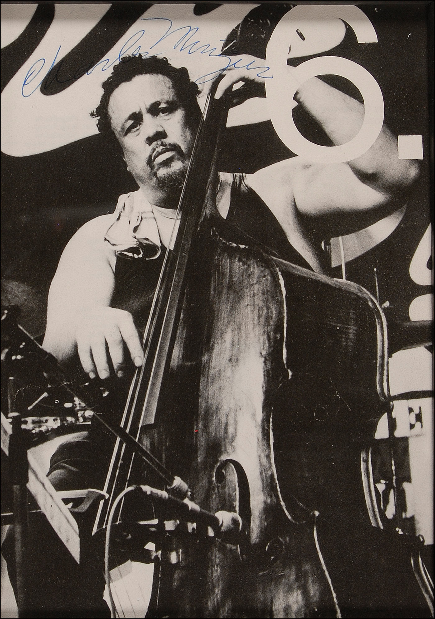 Influential jazz bassist and composer (1922–1979) whose complex, innovative works meld elements of jazz, classical, and gospel. Rare matte-finish 5.25 x 7.5 photo of Mingus playing his bass on stage, signed in blue ballpoint. Matted and framed to an overall size of 9.25 x 11.75. In fine condition. Mingus is seldom seen in signed photos.