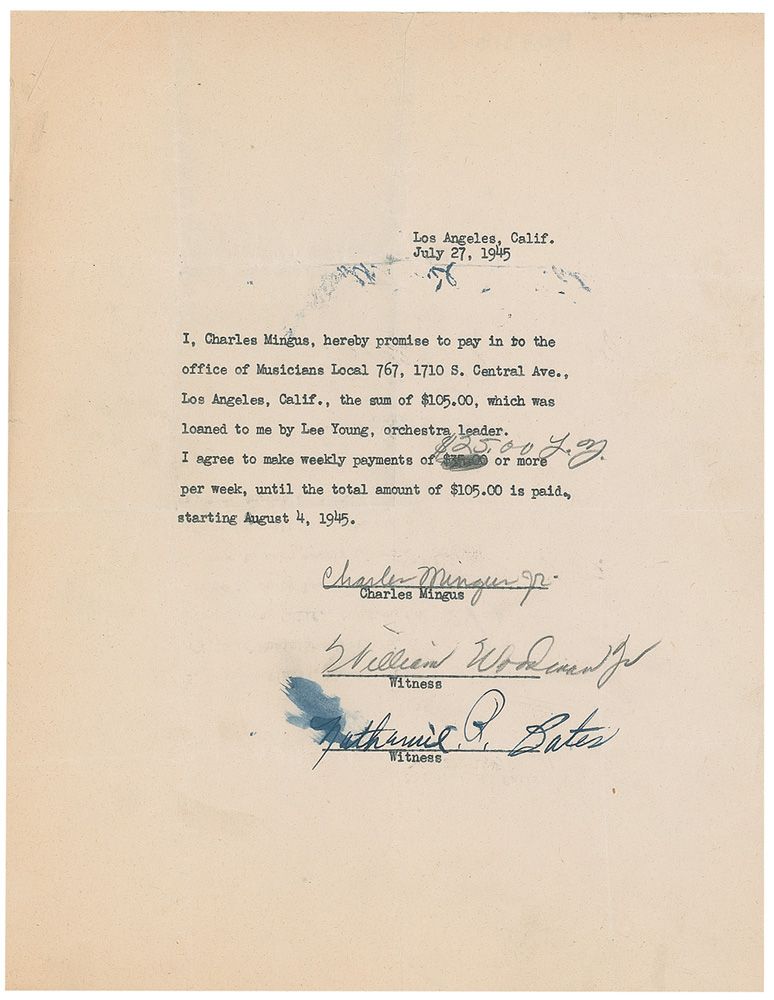 DS, signed in pencil “Charles Mingus, Jr,” one page, 8.5 x 11, July 27, 1945. In full: “I, Charles Mingus, hereby promise to pay in to the office of Musicians Local 767, 1710 S. Central Ave., Los Angeles, Calif., the sum of $105.00, which was loaned to me by Lee Young, orchestra leader. I agree to make weekly payments of $35.00 [amount crossed out by Young who has penciled and initialed “$25.00 L.Y.”] per week, until the total amount of $105.00 is paid, starting August 4, 1945.” Signed at the conclusion in pencil by Mingus and witness William Woodman, Jr., and signed in fountain pen as a witness by Nathaniel P. Bates. In very good condition, with intersecting folds, scattered wrinkles and creases, and mirroring of the Bates signature.