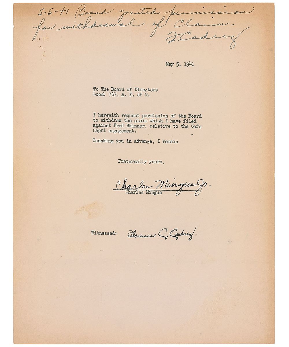 DS, signed “Charles Mingus, Jr,” one page, 8.25 x 11, May 5, 1941. Document sent to the Board of Directors of his union. In full: “I herewith request permission of the Board to withdraw the claim which I have filed against Fred Skinner, relative to the Café Capri engagement. Thanking you in advance, I remain Fraternally yours.” Document has been witnessed with a stamped signature of Florence Cadrez, who also writes at the top, “5-5-41 Board granted permission for withdrawal of claim. F. Cadrez.” In very good condition, with scattered toning, a bit heavier to edges and a few small edge tears. Accompanied by a photocopy of Mingus’s claim. The initial claim to which Mingus refers was filed on April 25th and states that he was hired to play with Fred Skinner’s Band at Billy Berg’s Club Capri for one week, but after an argument with Skinner, was fired. He claims that he was only paid for five days and is due payment for the final two. Two weeks after filing the claim, Mingus presumably calmed down and decided to drop the claim rather than fortify the wall between himself and yet another fellow musician. Also signed by the union’s recording secretary, jazz composer and pianist Florence Cadrez, a celebrity in her own right, this document captures the calm after the storm—a moment of retreat from the jazz legend who lived on the attack.
