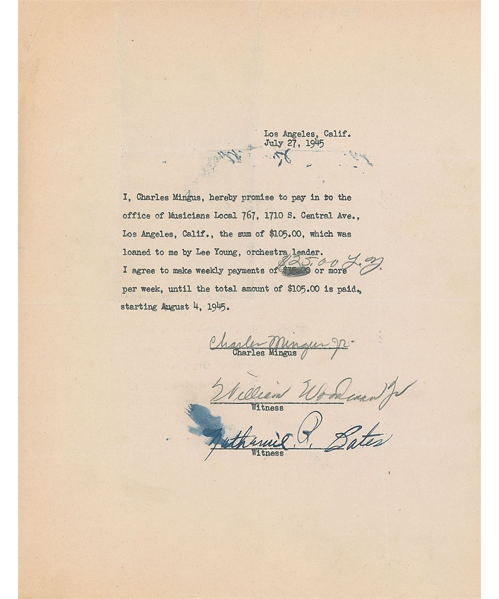 DS, signed in pencil “Charles Mingus, Jr,” one page, 8.5 x 11, July 27, 1945. In full: “I, Charles Mingus, hereby promise to pay in to the office of Musicians Local 767, 1710 S. Central Ave., Los Angeles, Calif., the sum of $105.00, which was loaned to me by Lee Young, orchestra leader. I agree to make weekly payments of $35.00 [amount crossed out by Young who has penciled and initialed “$25.00 L.Y.”] per week, until the total amount of $105.00 is paid, starting August 4, 1945.” Signed at the conclusion in pencil by Mingus and witness William Woodman, Jr., and signed in fountain pen as a witness by Nathaniel P. Bates. In very good condition, with intersecting folds, scattered wrinkles and creases, and mirroring of the Bates signature.