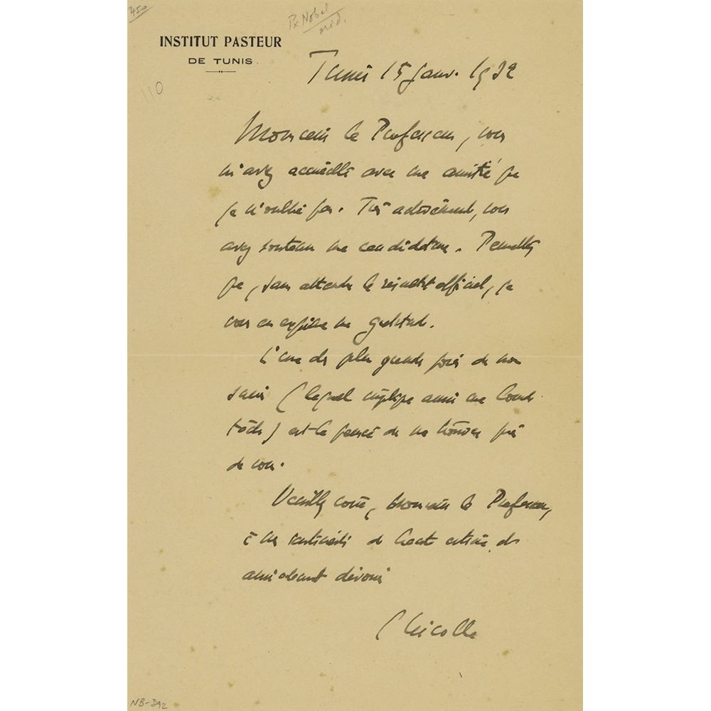 French bacteriologist (1866–1936) who received the Nobel Prize in Medicine for his identification of lice as the transmitter of epidemic typhus Rare ALS in French, signed “C. Nicolle,” one page, 5.25 x 8.25, Institut Pasteur de Tunis letterhead, January 15, 1929. Untranslated handwritten letter from the Pasteur Institute in Tunis, where he served as director from 1903 until his death. In fine condition.