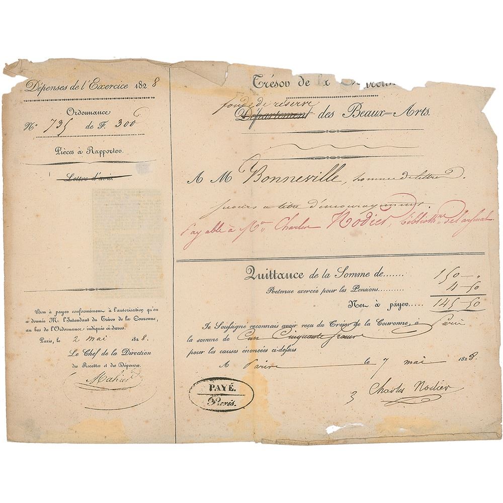 Partly-printed DS in French, one page, 11.5 x 9, May 7, 1828. Untranslated financial document signed at the conclusion by Nodier. In very good condition, with light staining, edge tears, and areas of paper loss; the signature is clean and unaffected. Accompanied by an untranslated three-page manuscript document in French, mentioning Nodier.