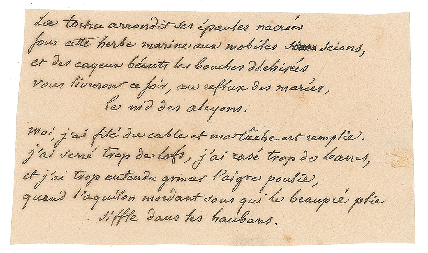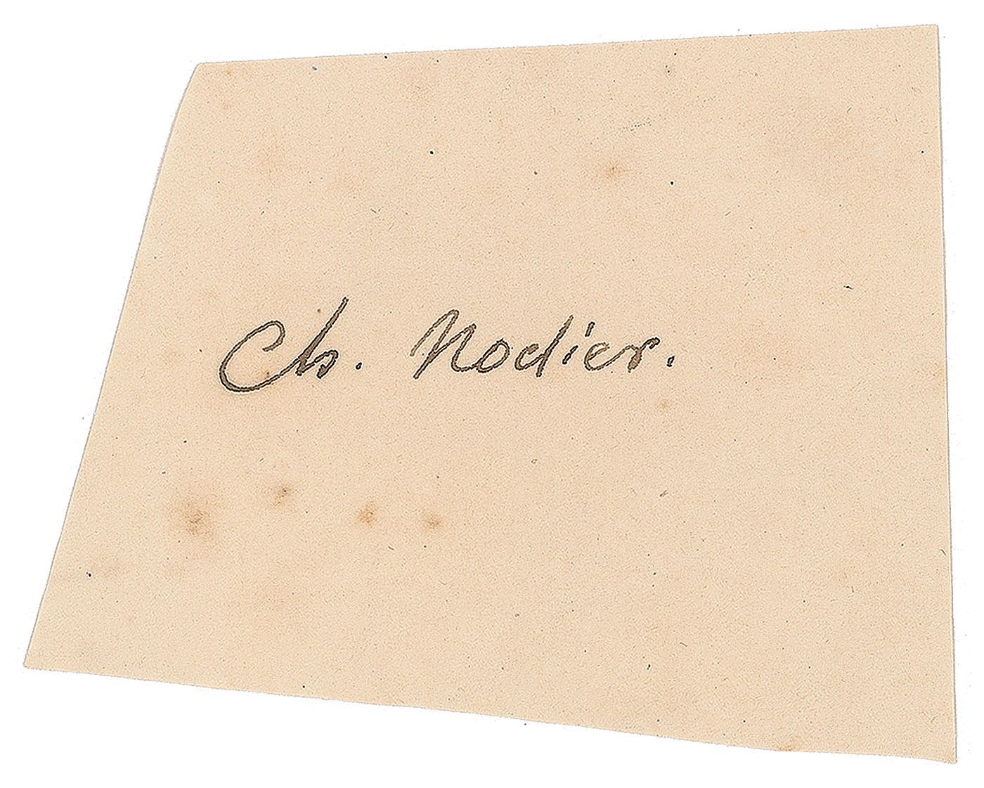 Influential French author and librarian (1780–1844) who introduced a younger generation of Romanticists to the conte fantastique, gothic literature, and vampire tales. Untranslated handwritten poem in French by Nodier, unsigned, consisting of ten neatly penned lines of poetry on an off-white 4.25 x 2.5 sheet. Includes is an ink signature, "Ch. Nodier," on an off-white 2.25 x 1.75 slip. In overall fine condition, with irregularly trimmed edges. Accompanied by an engraving with a preprinted signature.
