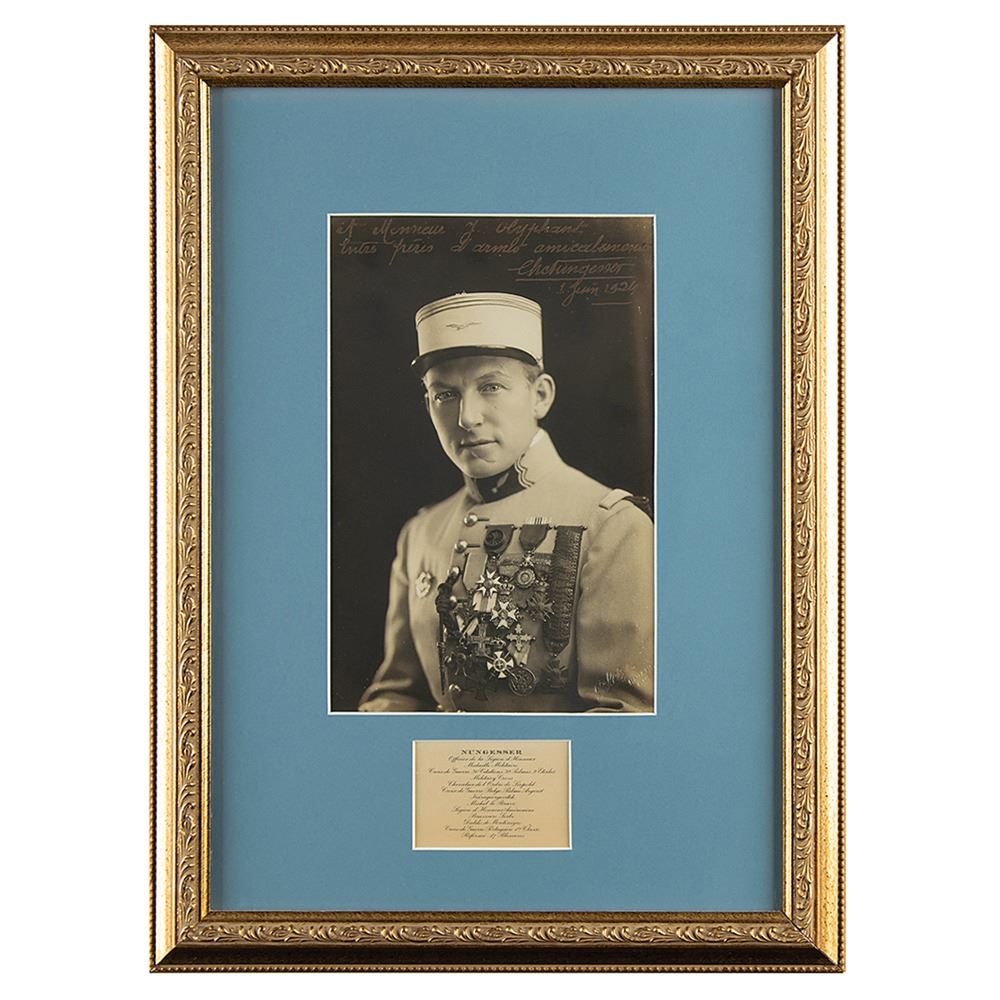 Vintage matte-finish 6.25 x 9.5 photo of Nungesser in uniform, signed and inscribed across the top in fountain pen, "A Monsieur J. Olyphant, entre freres…Ch. Nungesser, 1 Juin 1924.†Nicely matted and framed with a biographical card to an overall size of 13.25 x 18. In fine condition, with poor-to-moderate handwriting contrast against the dark background.