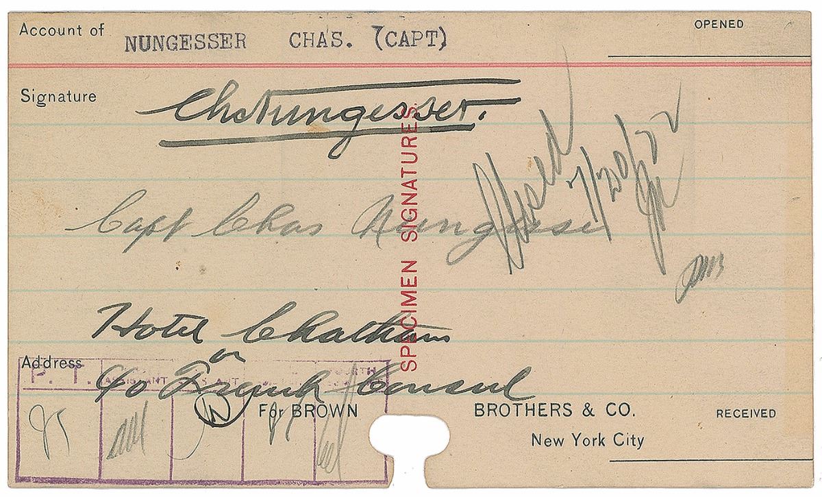 French pilot and WWI fighter ace (1892–1927) who mysteriously disappeared on an attempt to make the first non-stop transatlantic flight from Paris to New York. Bold fountain pen signature, “Cha. Nungesser,” on an off-white 6 x 3.5 accounting file card. In fine condition.