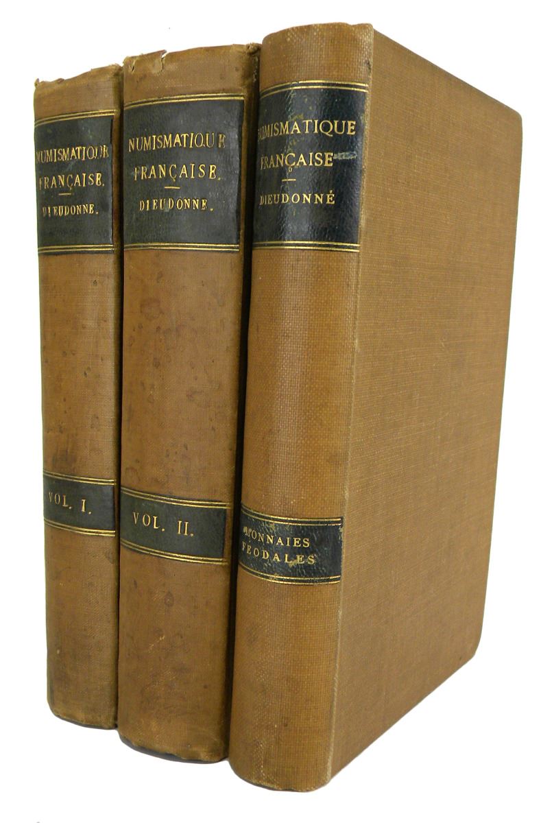 Blanchet, A., and A. Dieudonné. MANUEL DE NUMISMATIQUE FRANÇAISE. TOME PREMIER: MONNAIES FRAPPÉES EN GAULE DEPUIS LES ORIGINES JUSQU'A HUGUES CAPET. Paris, 1912. [with] TOME DEUXIÈME: MONNAIES ROYALES FRAN‚AISES DEPUIS HUGUES CAPET JUSQU'À LA RÉVOLUTION. Paris: Picard, 1916. [with] TOME QUATRIÈME: MONNAIES FÉODALES FRANÇAISES. Paris: Picard, 1936. All first editions. Three volumes of four [the third volume, covering tokens and jetons, is not present]. 8vo, contemporary matching tan cloth; spines with green morocco spine labels, lettered in gilt. Bindings a bit worn, but sound. Near fine. See catalogue for full description.
